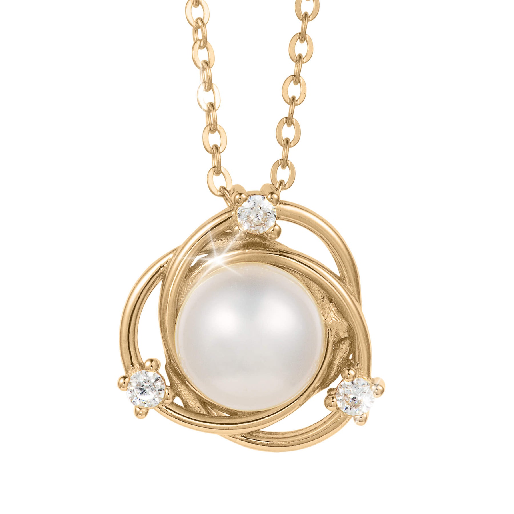 Crafted from sterling silver, this ladies pendant boasts a twisted mount finished in a luxurious touch of yellow gold. At the heart of the pendant lies a luminous freshwater pearl, symbolizing purity and beauty. Nestled within the intricate design of the mount, these pearls exude a timeless charm that transcends trends and fads. Their iridescent lustre adds a touch of sophistication to any ensemble, making them the perfect choice for any occasion.
