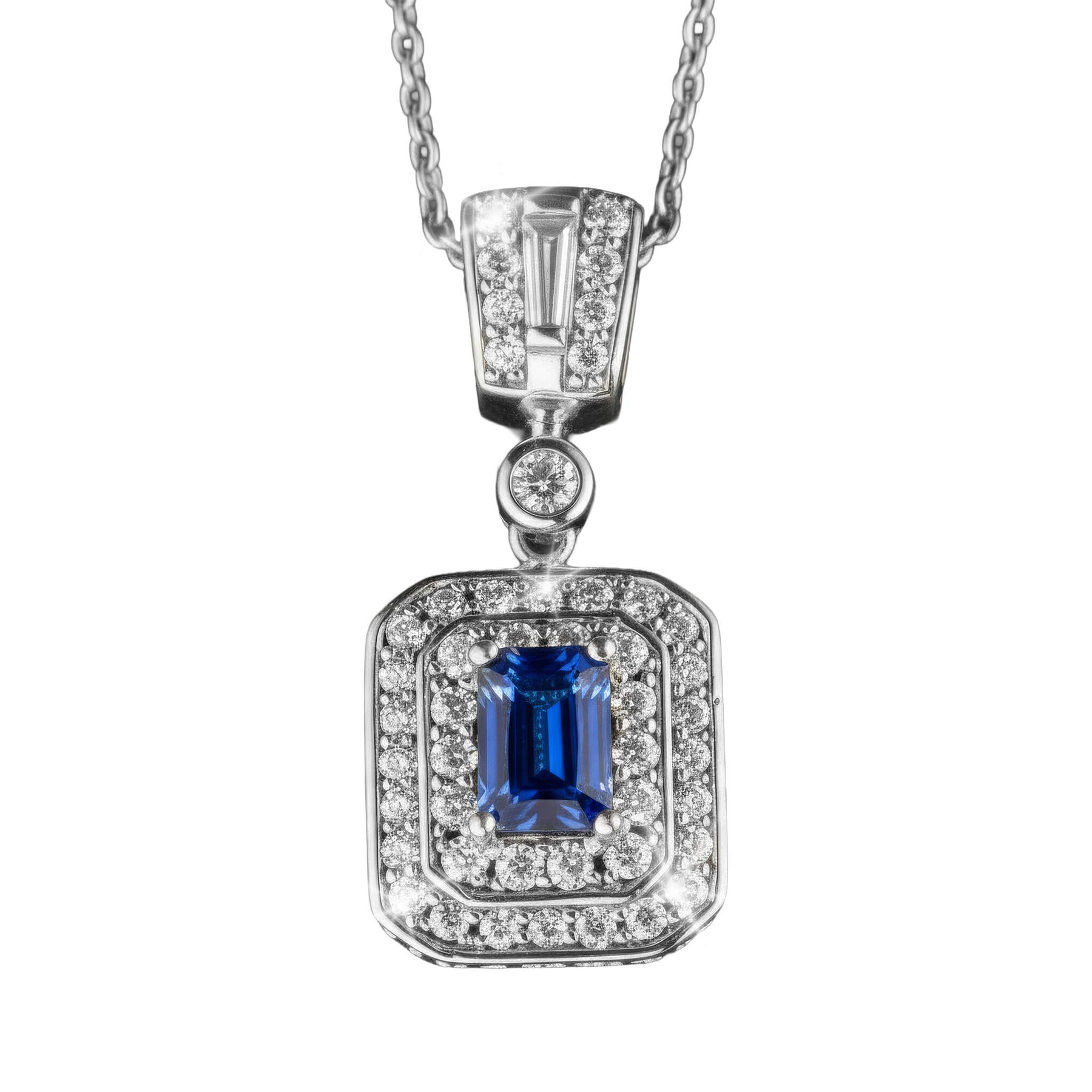 Inspired by the striking geometry of Miami's golden age, the "South Beach Deco Pendant" is a statement piece crafted for sophisticated style. Its distinct design features precise cuts and highly polished silver, beautifully framing a cascade of radiant Diamondeau® - flawless simulated diamonds that catch the light with every movement. This necklace is the perfect choice for the modern collector seeking to bring a touch of dazzling, art-inspired luxury to their collection.