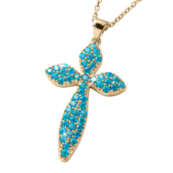 A radiant combination of sterling silver, finished in 18k yellow gold. The cross is adorned with outstanding neon blue Apatite stones. The vibrant hues of these gemstones radiate a mesmerizing glow, evoking a sense of tranquillity and spirituality. This pendant is not only a testament to style and beauty but also a cherished symbol of faith and devotion