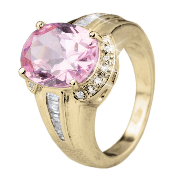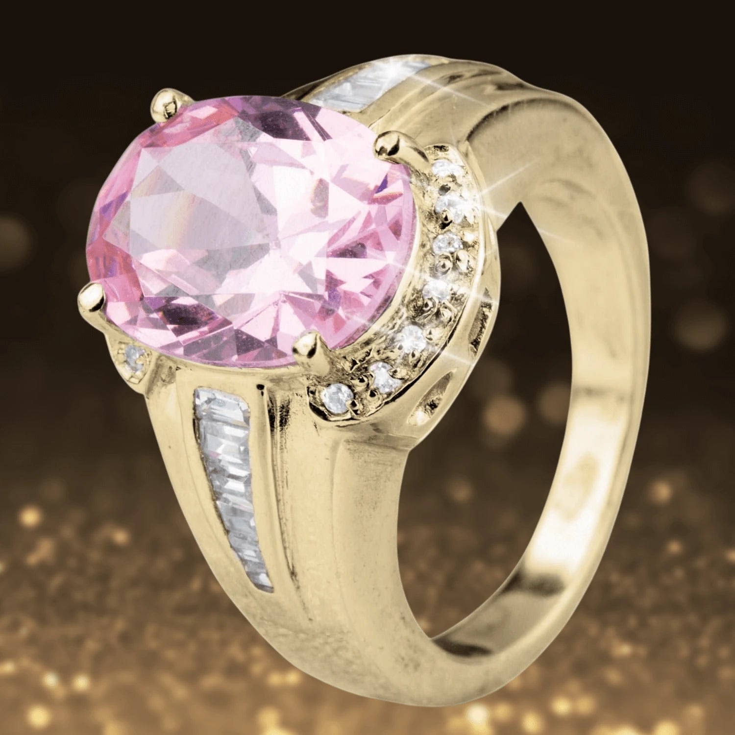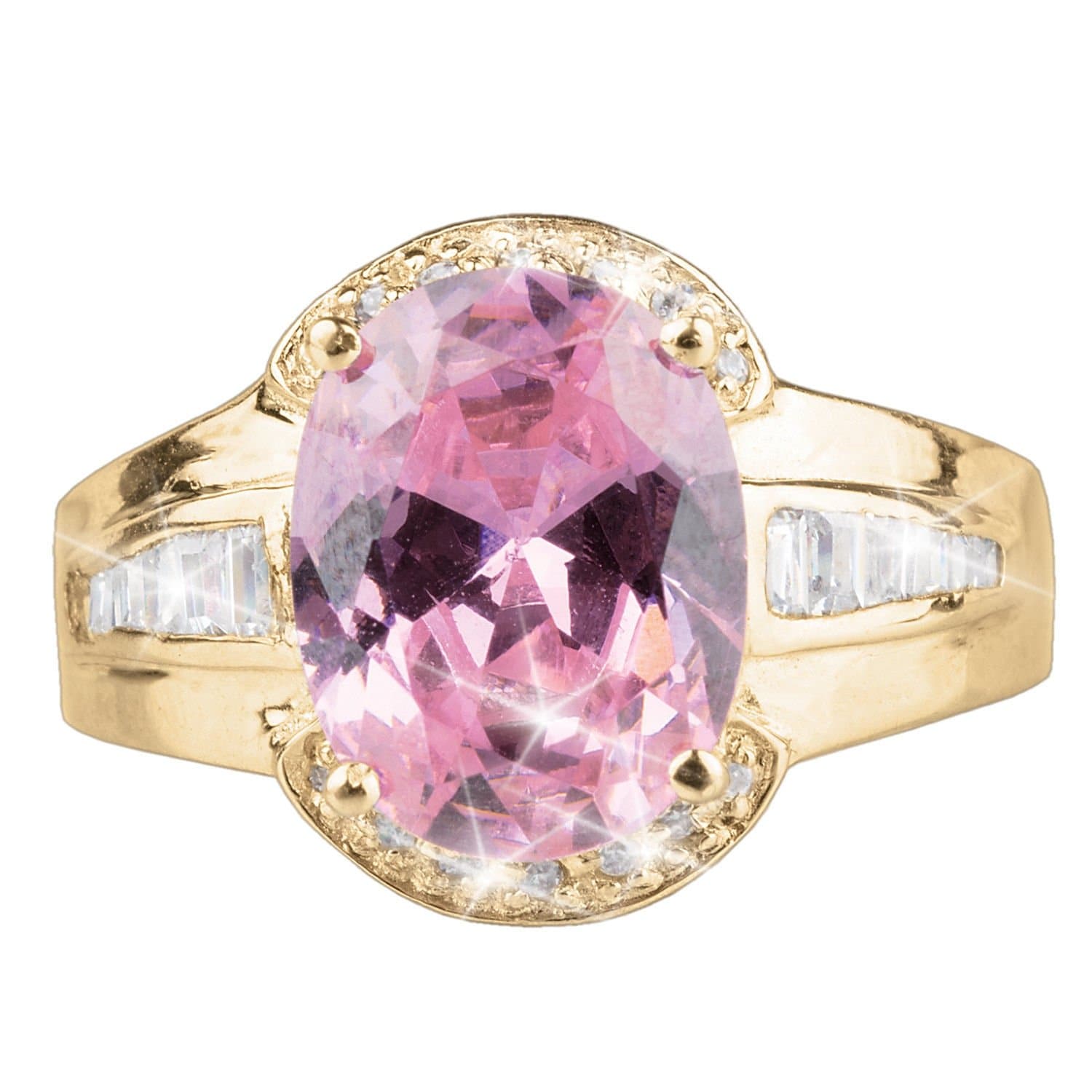 Pink diamonds are incredibly beautiful, unique and scarce. Natural colored diamonds cost a premium price and are considered highly elite and sort after. Laurence Graff, a British billionaire, bought the most expensive diamond at auction - an impressive 24.78 carat stone for $47.3 million dollars. You don’t need to have that kind of money in the bank for this ring…crafted in sterling silver, plated in 18k yellow gold and set with an impressive 5.05ct of pink Diamondeau® - flawless simulated diamond.