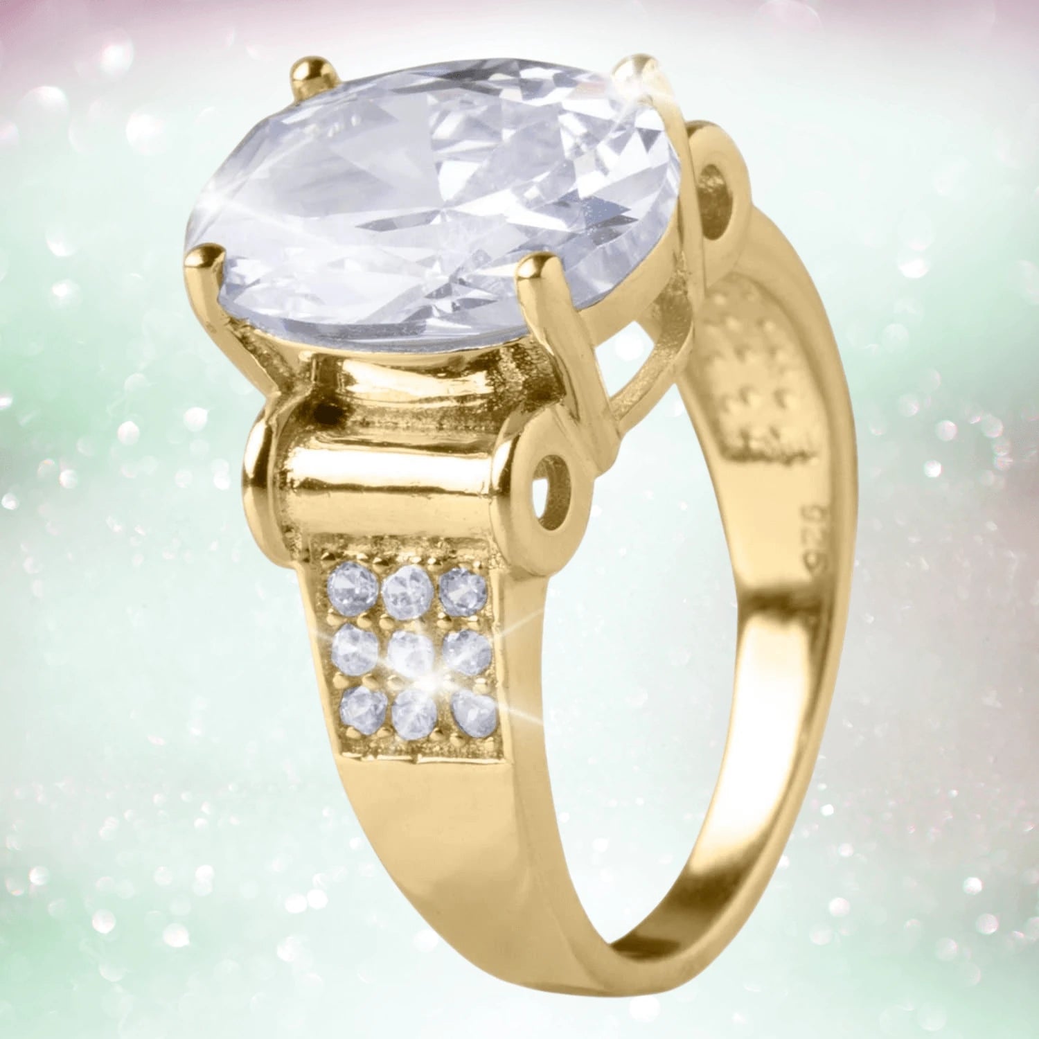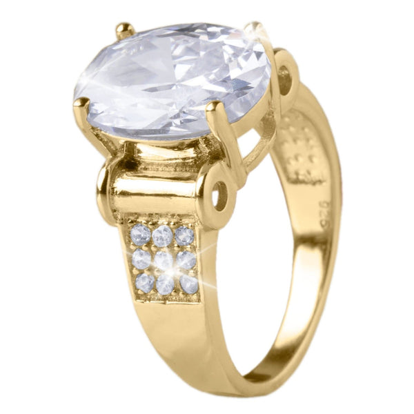 Diamondeau® - flawless simulated diamond last forever making this piece the perfect heirloom; it can be passed down through generations. A single 5.05ct oval cut Diamondeau® - flawless simulated diamond holds center stage with a rhapsody of 18 further Diamondeau® - flawless simulated diamond nestling on the shoulders, where there sits a stunning scroll design. Fashioned in sterling silver plated in 18k yellow gold; a perfect item for your jewelry wardrobe.
