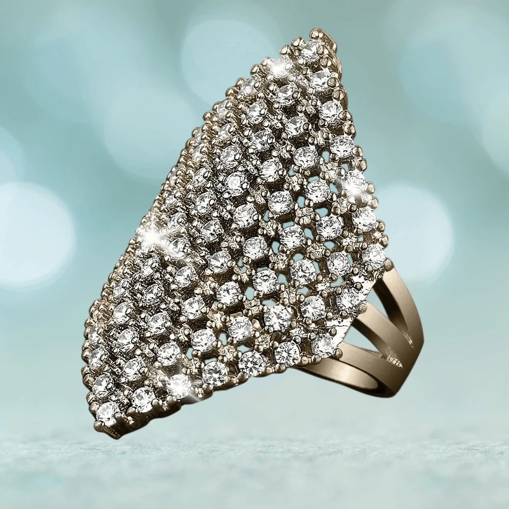 For months we have been searching the world for the perfect on trend dress ring for you our very discerning clients. It really was love at first sight with our beautiful Bella Ring. Over 1 Inch in height this truly spectacular, on trend, modern design will take your breath away as it glitters with 75 bright white Diamondeau® - flawless simulated diamond, which we have set into the finest solid silver luxuriously coated in rich 18K Yellow Gold. Magnificent presentation case.