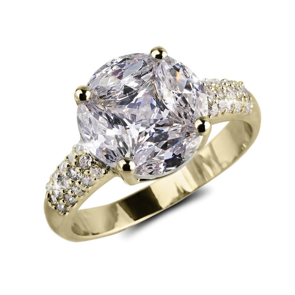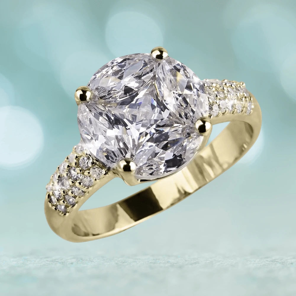 Capella is the brightest star in the constellation Auriga, like the star you are sure to shine bright with this cleverly crafted solitaire style ring. A scintillatingly bright AAA grade Princess cut Diamondeau® - flawless simulated diamond sits at the centre of four AAA grade marquise cut Diamondeau®, seamlessly producing the look of a 5 carat round stone. 30 more pave set round brilliant stones dress the shoulders of this beautiful ring. This monumental solitaire style ring will leave a lasting impression.
