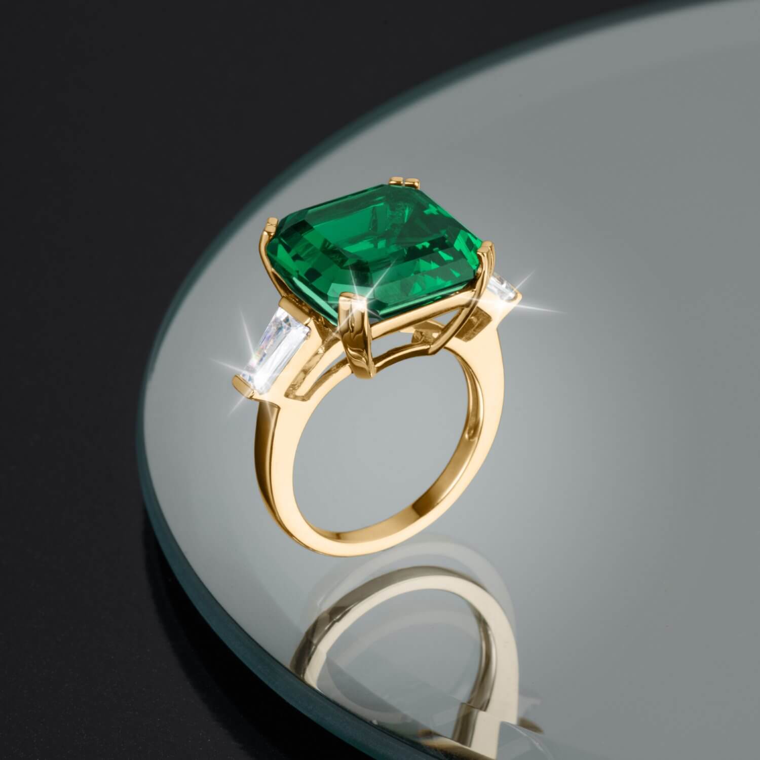 This beautiful ring really does look as if it has just been taken from the windows or vitrines of a high end 5th Avenue jewelers. The minimalist setting in solid sterling silver, plated in rich tones of 18k yellow gold actually help accentuate the feeling of luxury and help the stones shine in their own right. A gorgeous over 4ct vibrant green asscher cut gem has been set in the center and has been married with our Diamondeau® - flawless simulated diamond in a tapered baguette cut. Create a magical allure when wearing this ring.