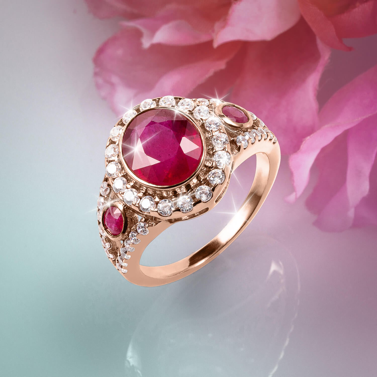 Exquisitely crafted in sterling silver, lavishly finished in 18k rose gold this ring merges modern design with classic details. An oval nearly 3 carat Ruby is at the heart of this design, surrounded by alluring sparkling Diamondeau®, flawless simulated diamond. The shoulders are set with even more shimmering Rubies.