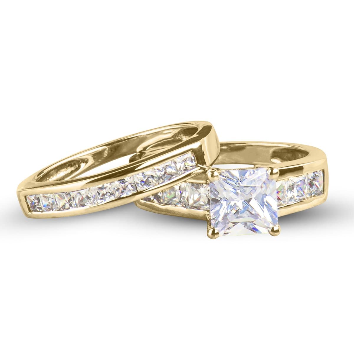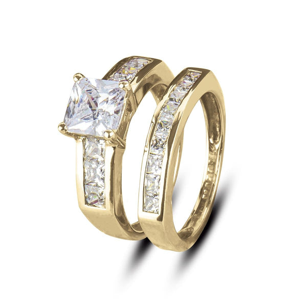 This delightful duo is made up of timeless styling. A 1.96ct princess cut solitaire Daniel Steiger created Diamondeau®, our exclusive substitute for natural mined diamond is flanked by 1.50ct of further sparkling gems; alongside sits a 1.00ct princess cut channel set eternity band. Complimenting each other beautifully or can be worn separately to suit your own taste the choice is yours. All set in the finest sterling silver, finished in 18k yellow gold.