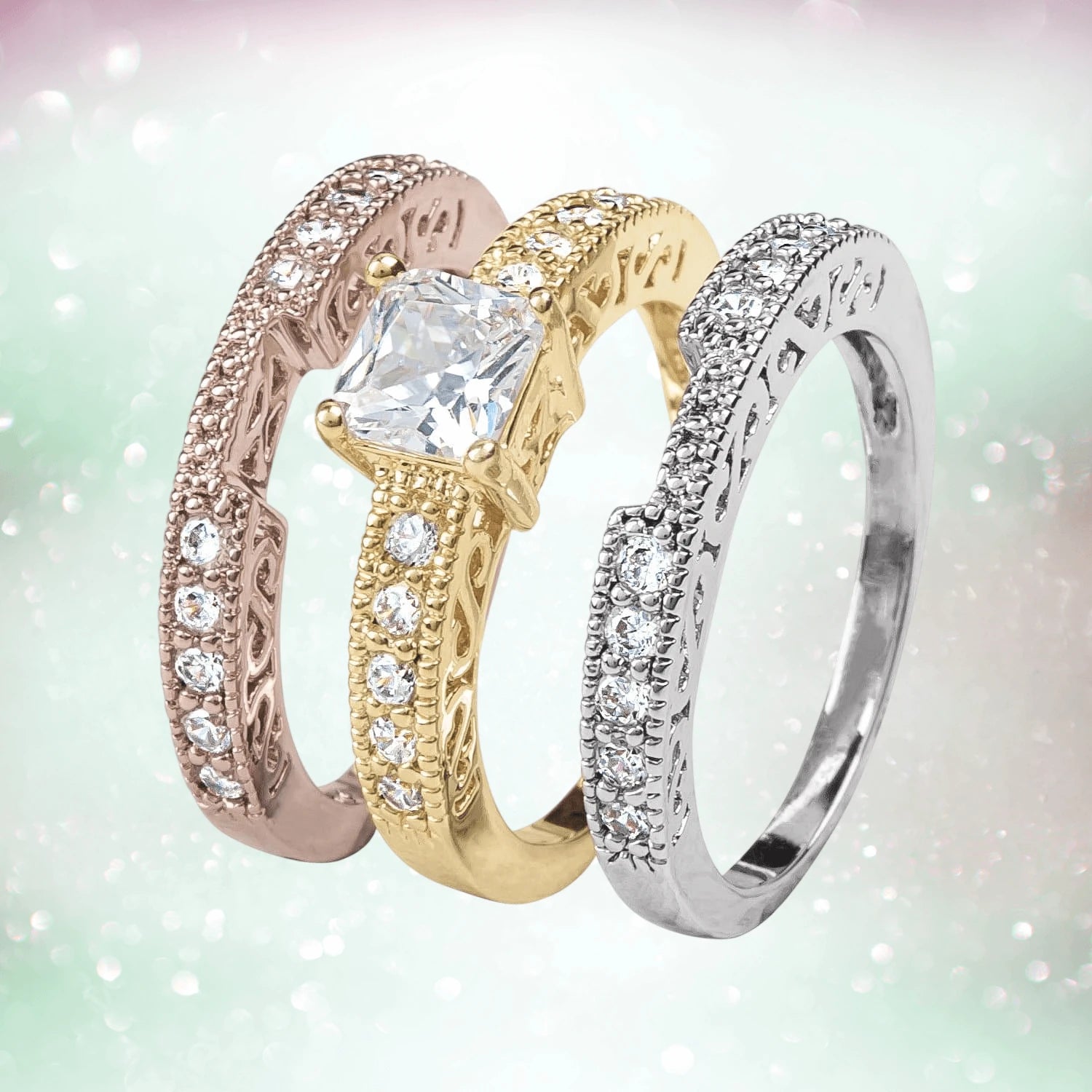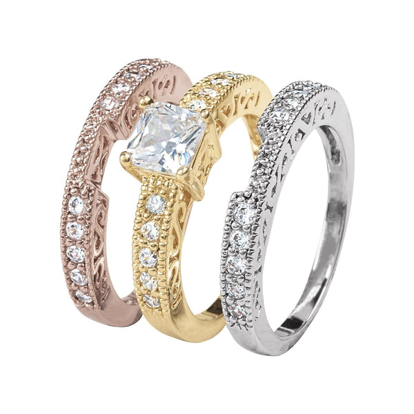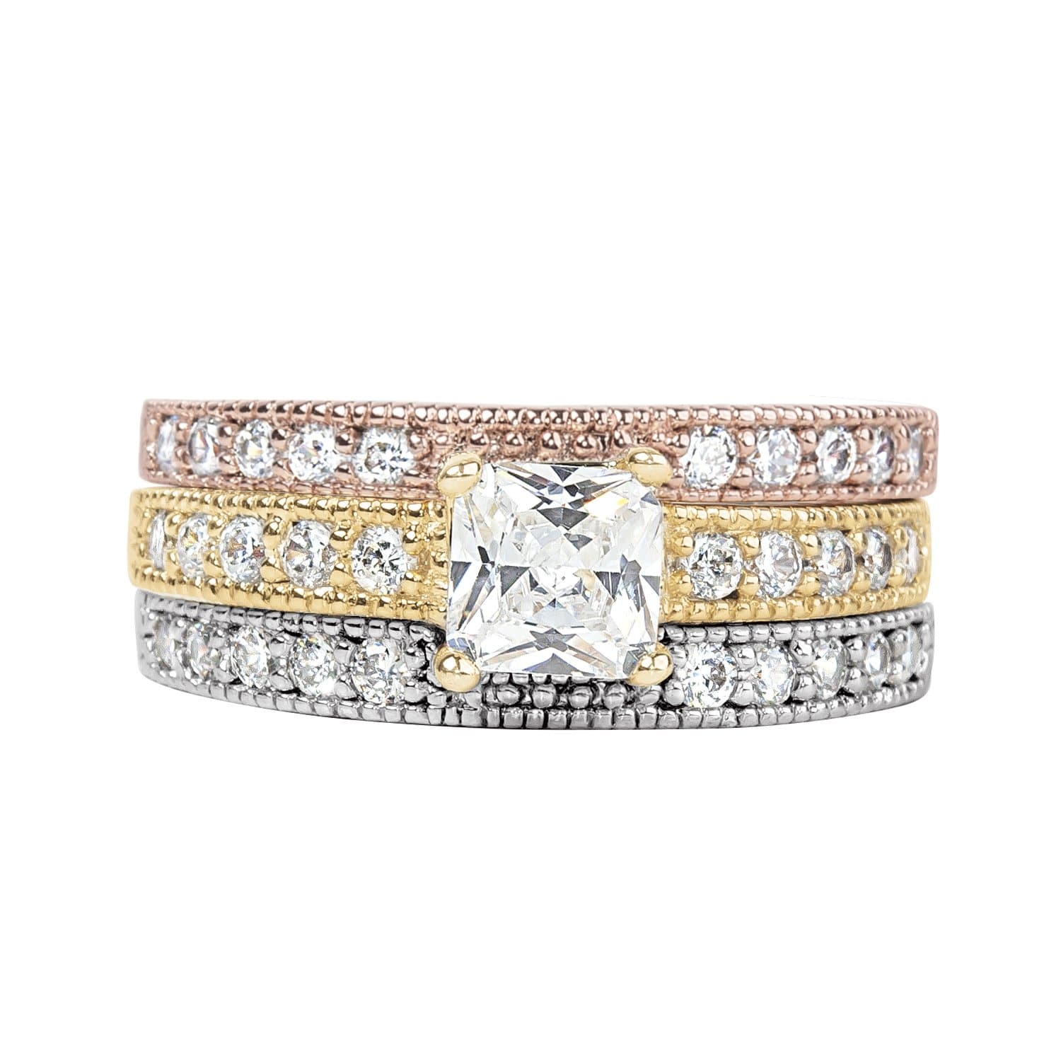 Celebrate your nuptials or an anniversary in a big and beautiful way with this enchanting bridal ring set. Wear together or individually for unique looks. Crafted from sterling silver, finished in rhodium, yellow and rose gold for a tri-color effect. It's over 1 carats which means that there's a flash of sparkle whenever you wave your hand, allowing you to add instant pizzazz to your entire look with a single piece of jewelry. Show her you care.