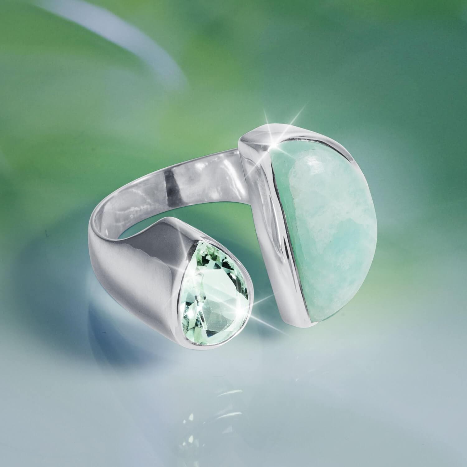 This playful design is one that can’t be missed. A blissful display of Amazonite and Green Amethyst in a half moon and peardrop shape, sit opposite each other. Amazonite’s energy is as powerful as the river from which it is named, and as bold as the legendary women warriors with whom it’s connected, it’s also known for it’s beauty and healing properties. Green Amethyst a rarer gem than its sister color in purple is known for it’s positive energy and a natural stress reliever. These outstanding duo of gems are brought together in a sterling silver mount. This will be a star in any jewelery box.