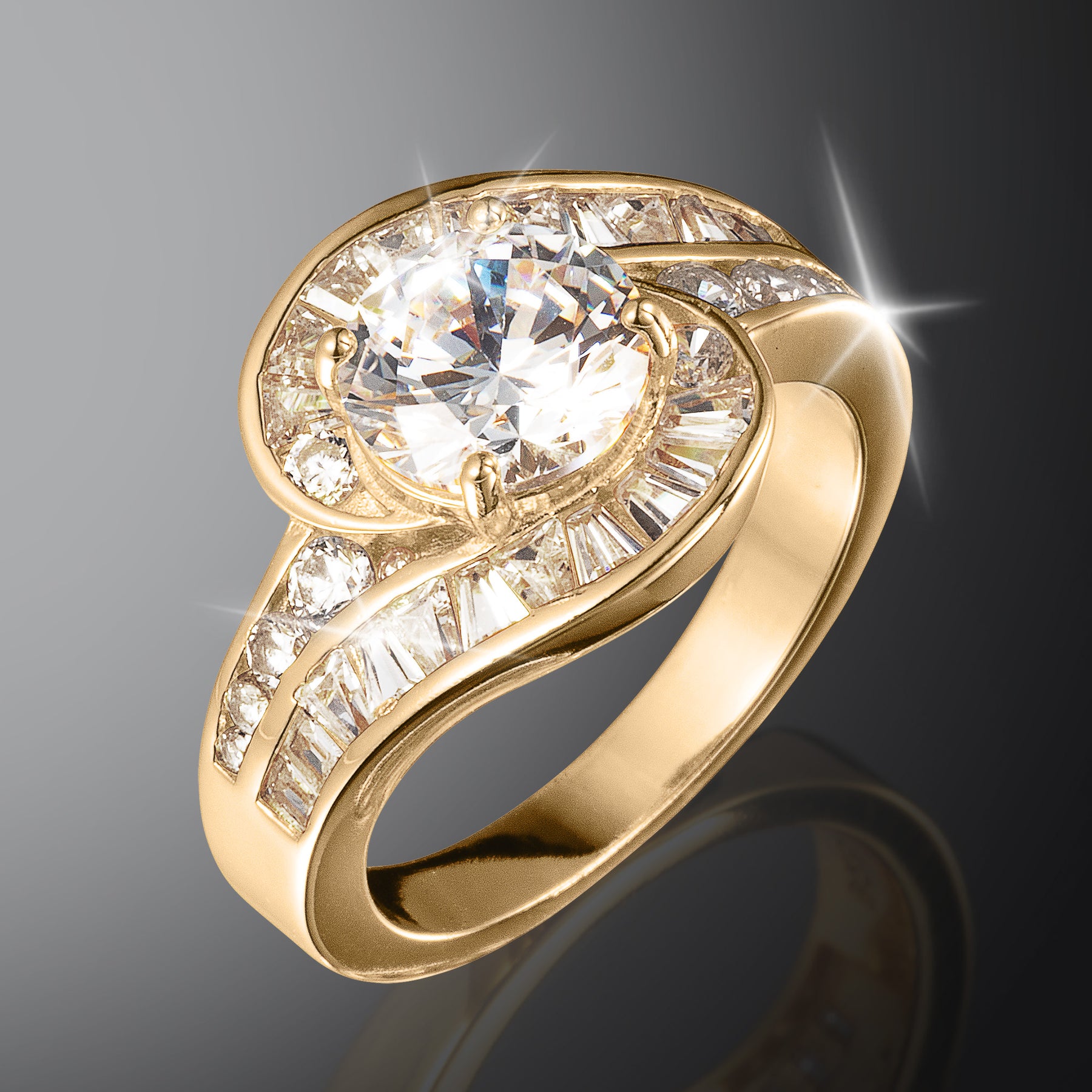 Meticulously crafted from sterling silver and bathed in a radiant 18k yellow gold finish, its centerpiece boasts a breath-taking solitaire that captures the essence of sophistication. As the eye travels along the band, a graceful wave of sparkling Diamondeau®, flawless simulated diamond stones encapsulate the center stone and adorn the shoulders, adding a touch of glamour and accentuating the ring’s elegance. Designed to adorn the hand of the discerning woman with unparalleled beauty.