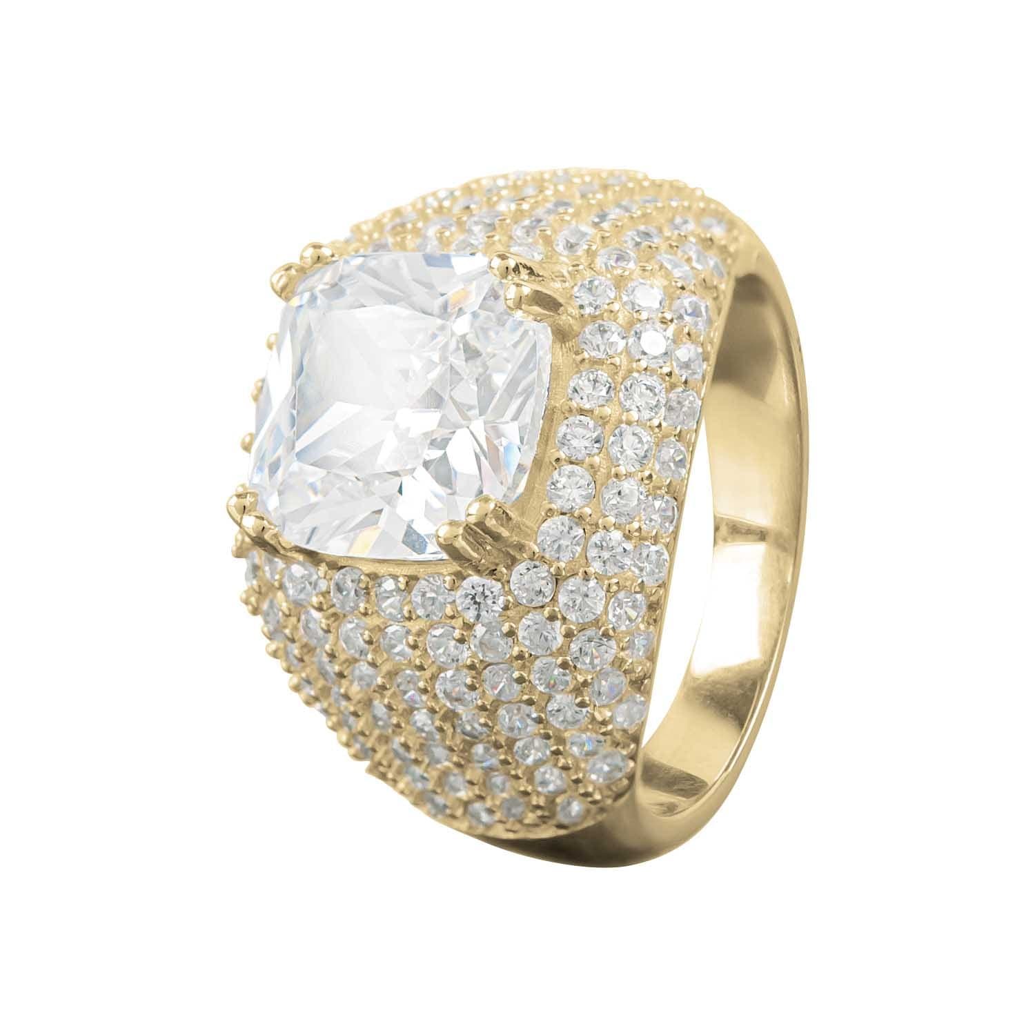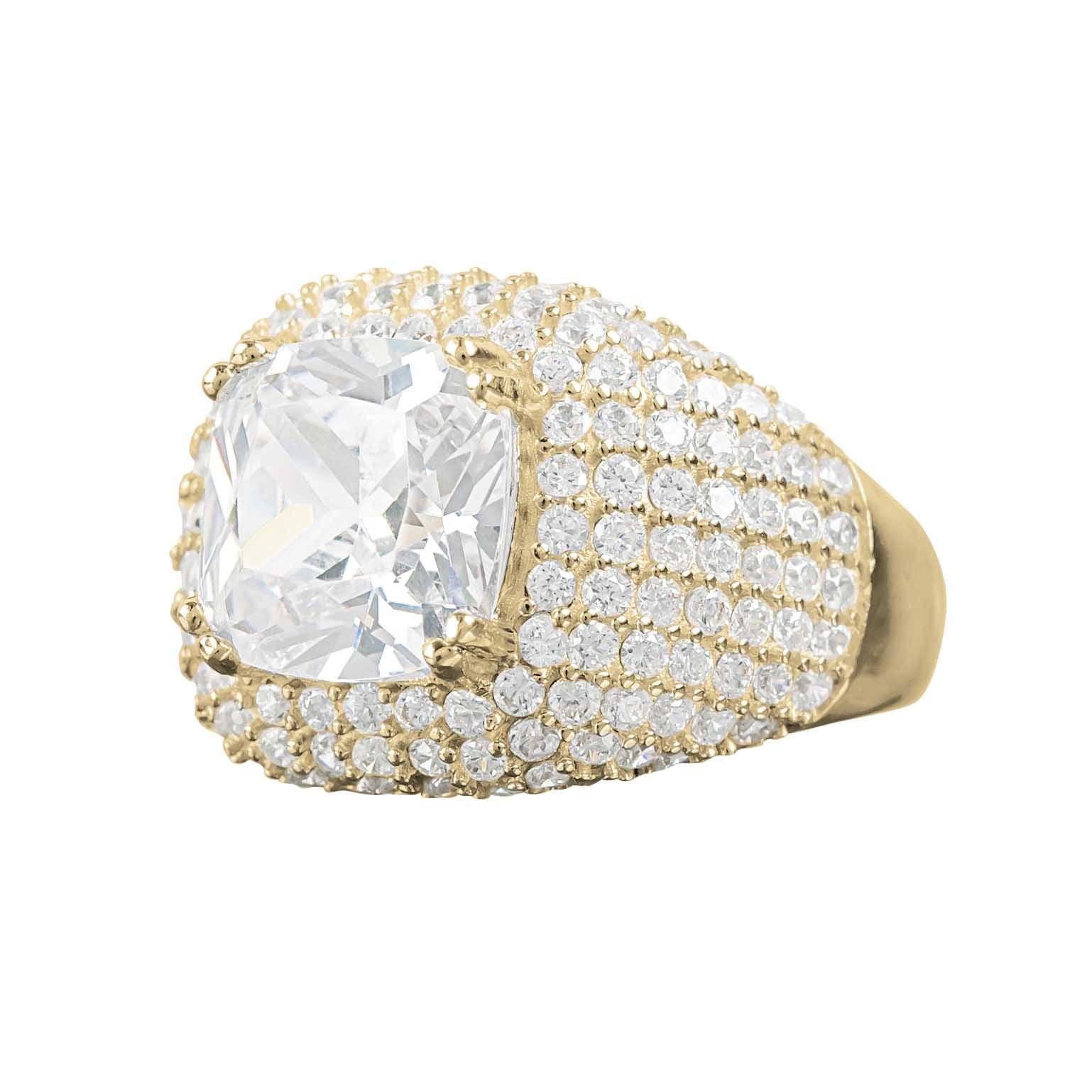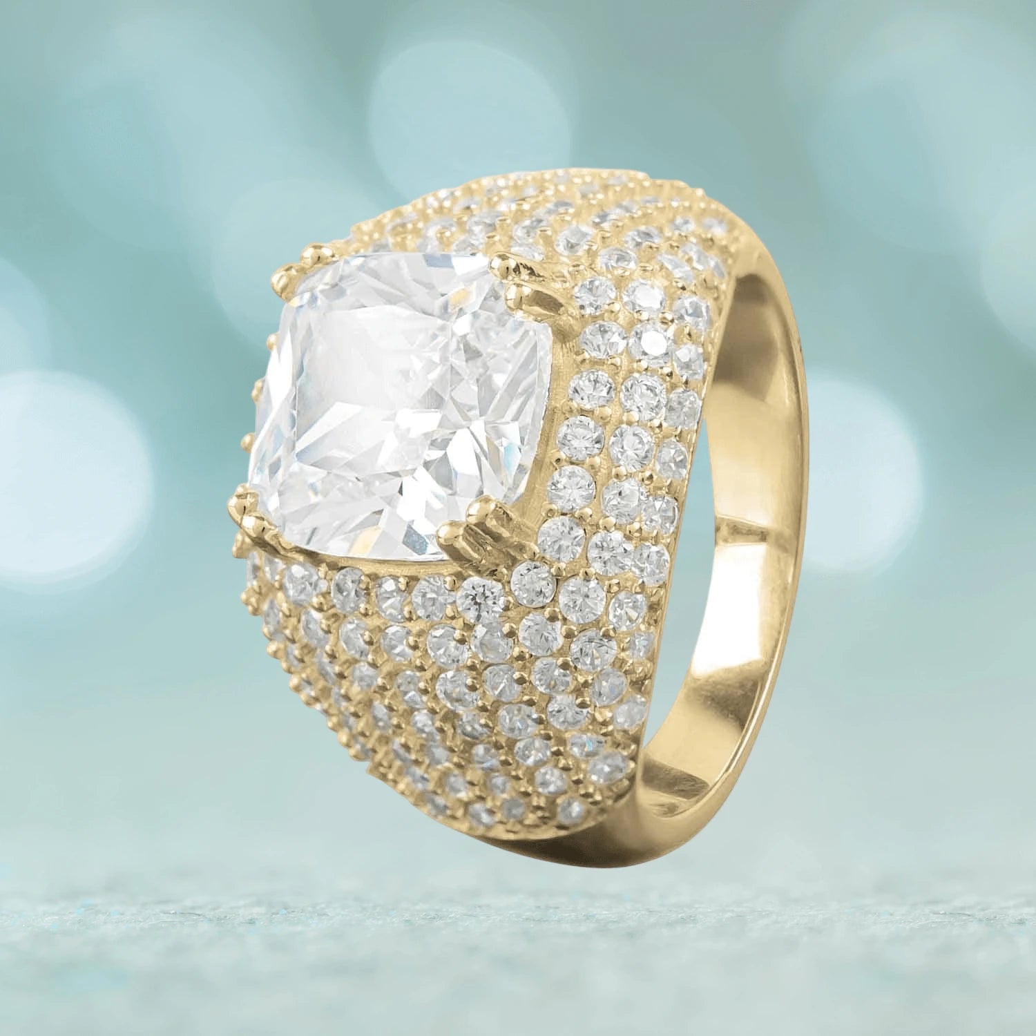 Mauna means mountain – we bring you a mountain of our signature Diamondeau® - flawless simulated diamond together in this ring. Formed from sterling silver plated in 18k yellow gold is a precision crafted dome; handset with over 100 Diamondeau® - flawless simulated diamond. At the epicentre is a 5.62ct princess cut Diamondeau® - flawless simulated diamond. A truly impressive ring by day or night.