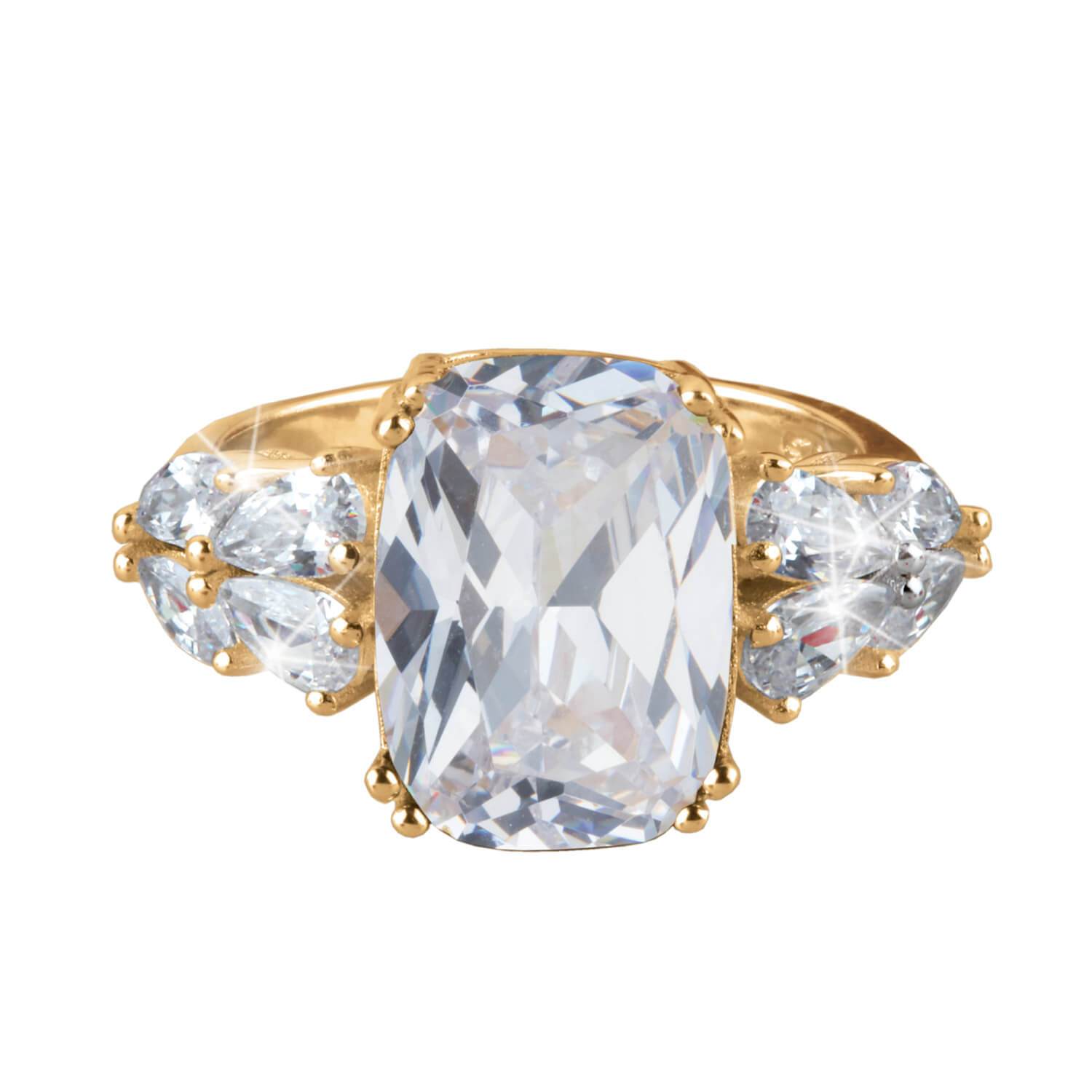 This ring is sure to take her breath away. The eye is drawn to this magnificent piece which features a stunning 5.8 carat Diamondeau® - flawless simulated diamond at the center, complemented by pear and marquise brilliant white Diamondeau® - flawless simulated diamond shoulder detail. Crafted in fine sterling silver, plated in 18k yellow gold.A glamorous look she will turn to often
