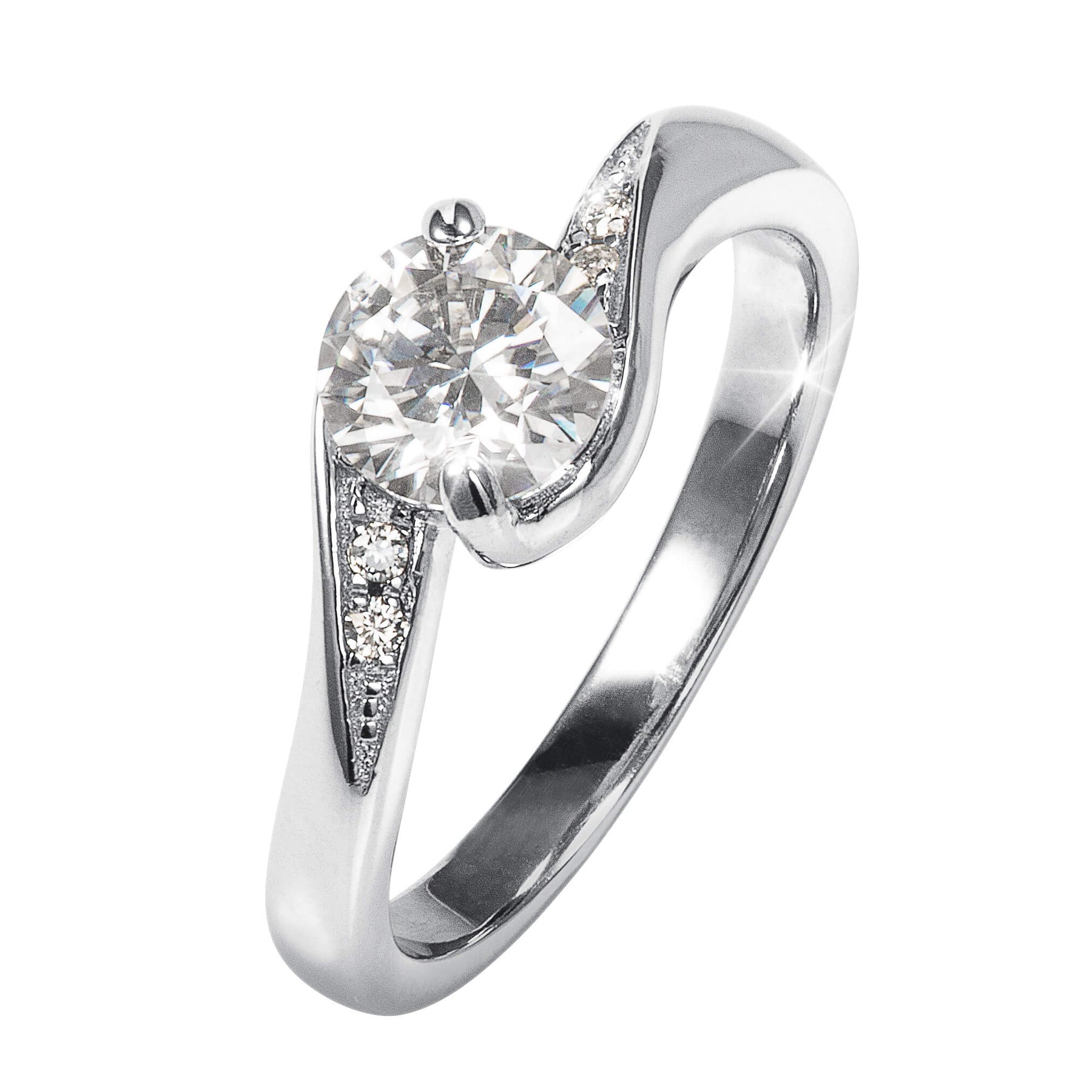 A masterpiece of elegance and grace. The sterling silver mount exudes sophistication with its delicate twists, embodying the essence of feminine charm. A nearly 1 carat solitaire Moissanite, a symbol of enduring love and beauty, sits majestically atop the mount. The ring’s shoulders are adorned with even more sparkle that dances with every movement. Wear this ring as a testament to your inner strength and elegance, and let its timeless charm adorn your every moment.