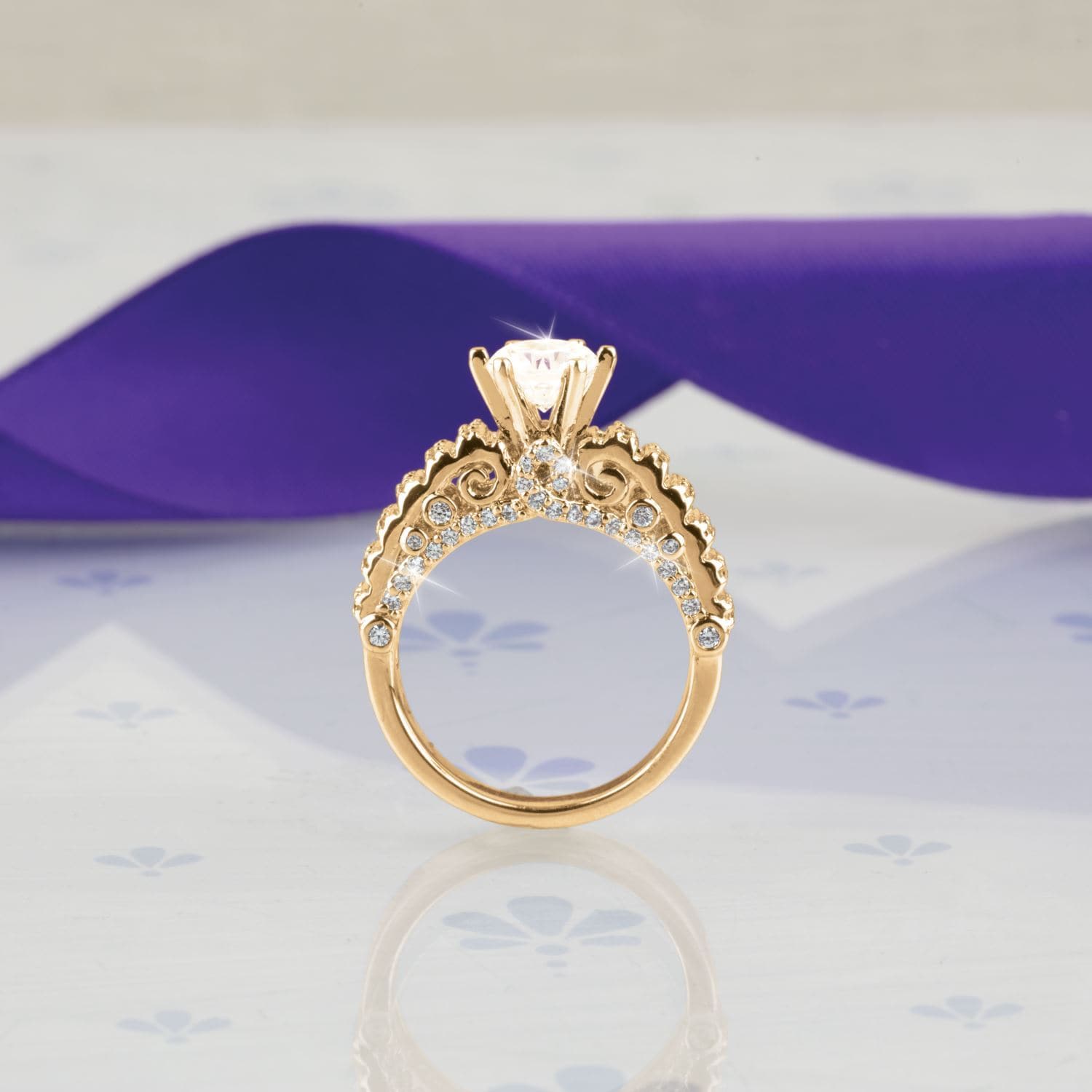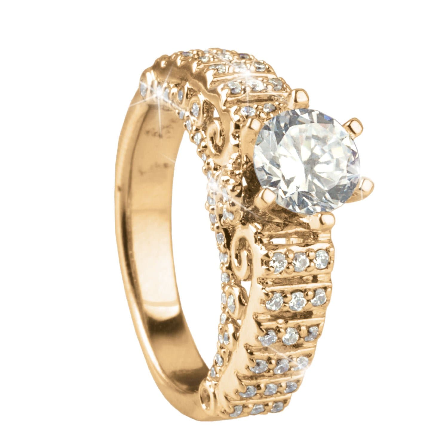 Dazzling Diamondeau® - flawless simulated diamond have been precision set into this magnificent designer setting. Expertly fashioned from gold plated sterling silver by our master craftsmen. Each piece features an undulating ornate setting on the shoulders set with over 90 glistening Diamondeau® - flawless simulated diamond and a 0.84ct round brilliant cut at its heart. A perfect ring to show you care.