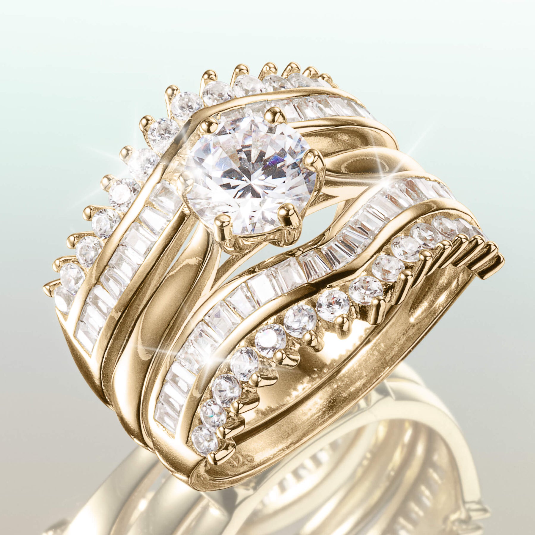 An exquisite ladies ring, expertly crafted with high quality sterling silver and finished with a luxurious gold finish. The two-piece set has a solitaire ring in the center which is simple yet elegant, designed to highlight the beauty of the central 1.67ct sparkling Diamondeau®, flawless simulated diamond. The solitaire sits perfectly in the center of two fancy bands, each one encrusted with more shimmering gems that radiate a stunning brilliance. A truly unique set that is sure to be cherished.