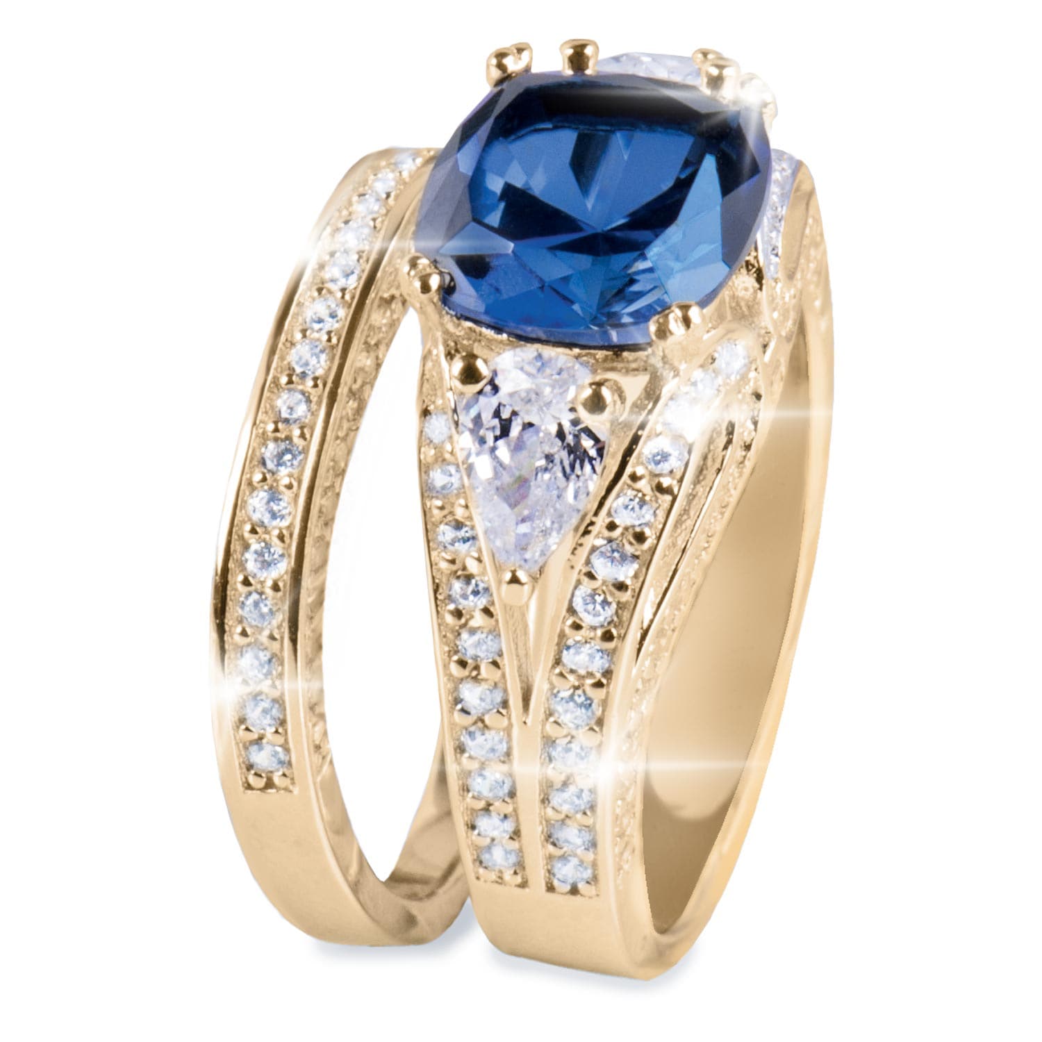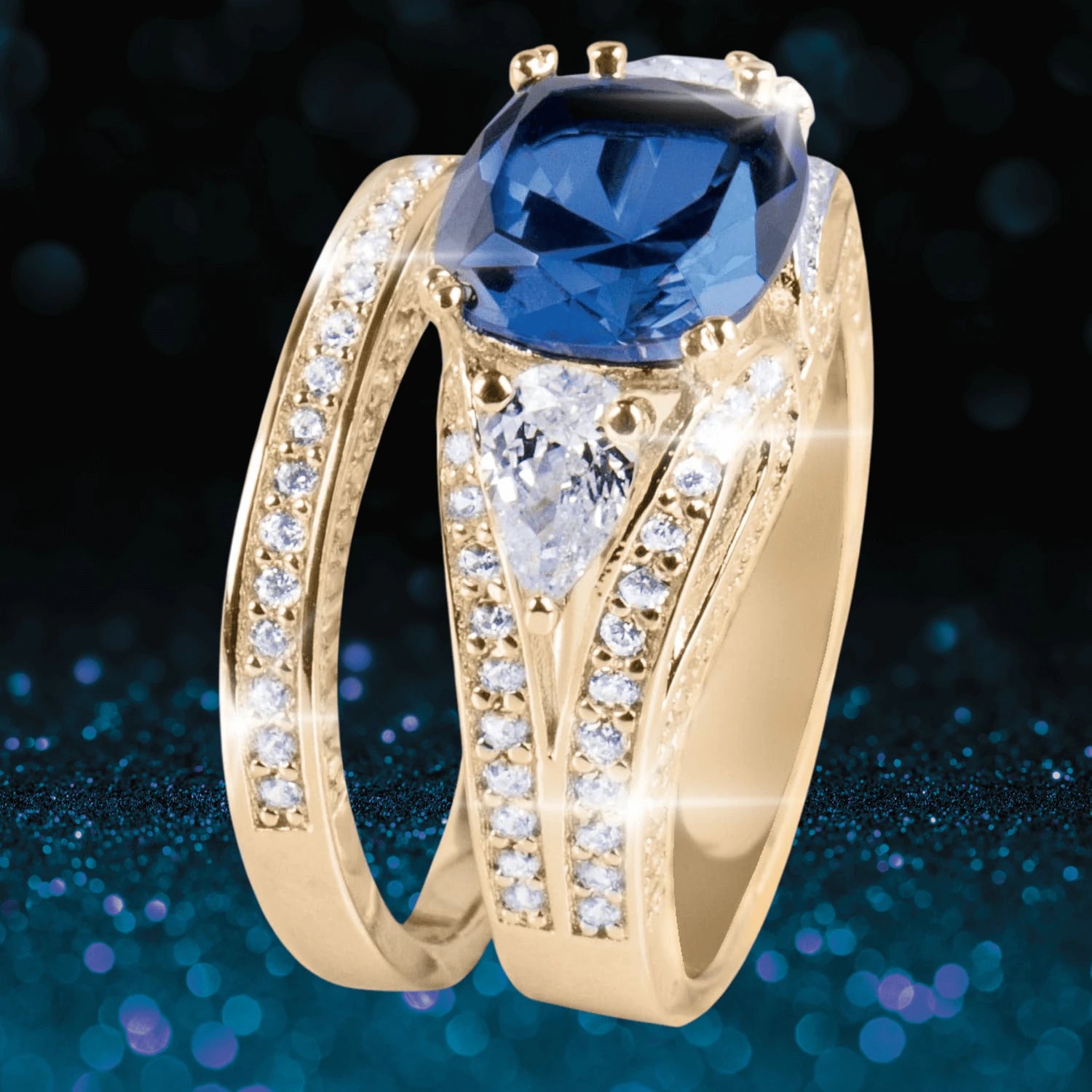 This stunning Diamondeau® - flawless simulated diamond duo bridal set will be sure to win her heart; and look stunning on her hand. Crafted from sterling silver luxuriously plated in 18k gold. The main ring features 4.12ct blue Diamondeau® - flawless simulated diamond with 0.78ct pear-shaped cut on the shoulders. To compliment the stunning look is a further 1.02ct of accent Diamondeau® - flawless simulated diamond sprinkled across the mount. Completing the look is a half eternity ring set with 0.45ct Diamondeau® - flawless simulated diamond.