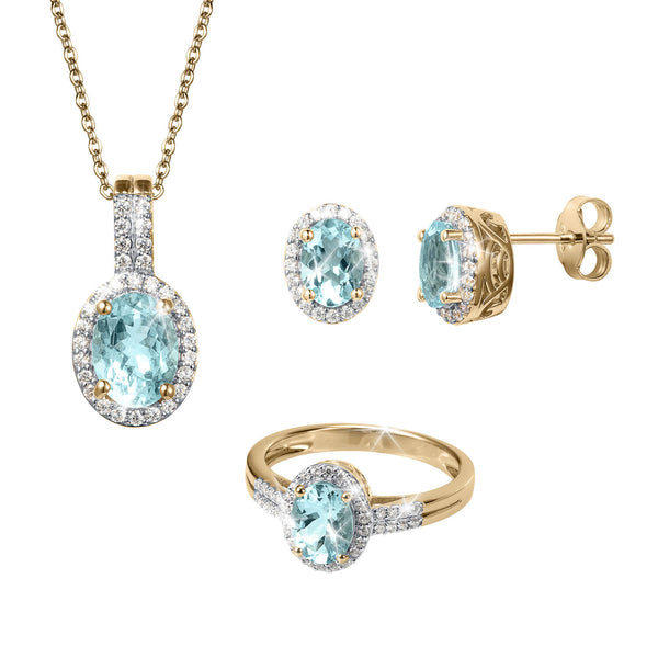 Aquamarine is the birthstone for March, and it is known for its beautiful blue color. It is often used in jewelry, and is said to have calming and soothing properties. The addition of shimmering white Diamondeau®, flawless simulated diamond, as a halo around the Aquamarine adds even more sparkle and shine to each piece. Each item is expertly crafted from sterling silver, finished in 18k yellow gold. A set including a ring, pendant, and earrings would make a thoughtful and stylish gift for someone celebrating a birthday in March.