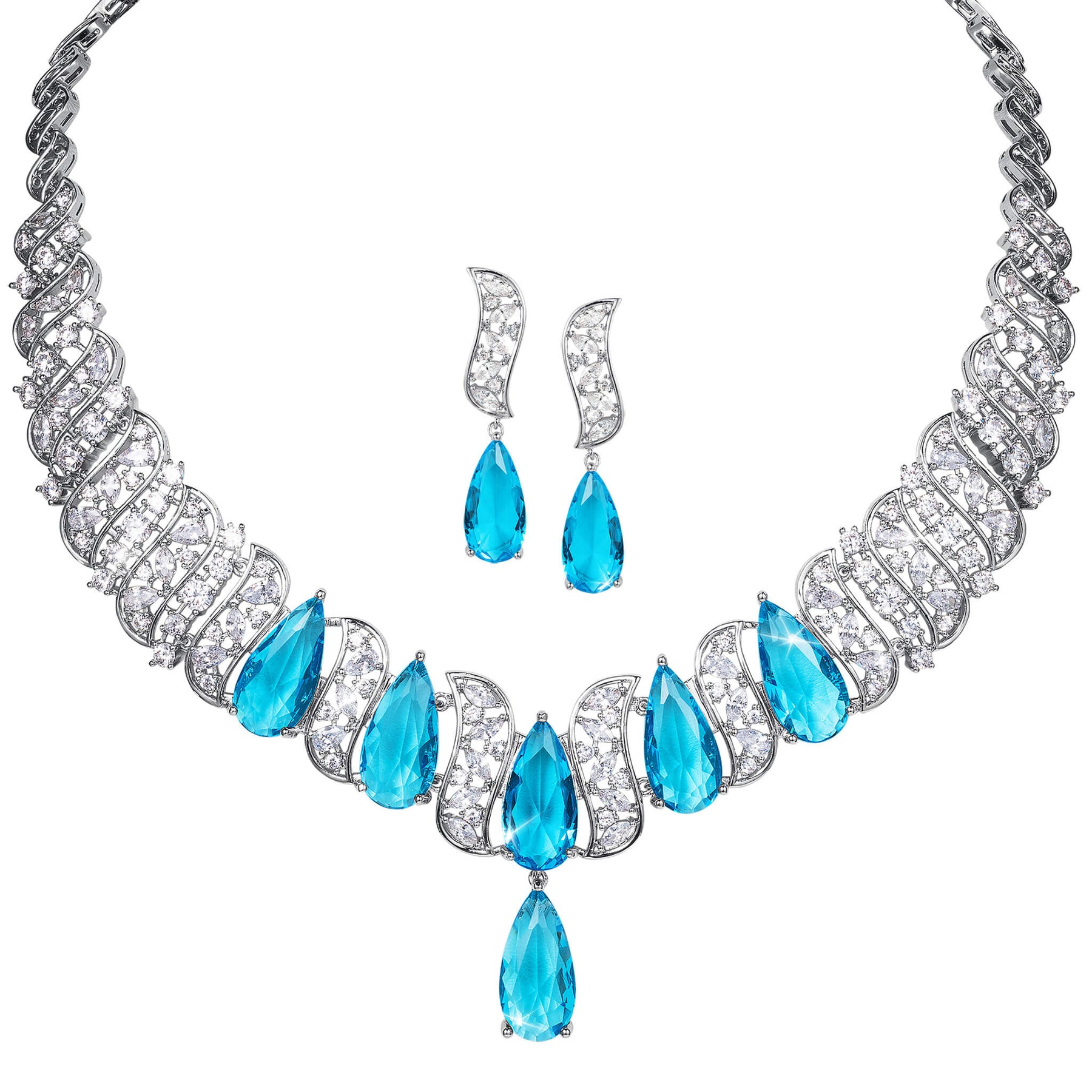 A breath-taking piece that combines bold design with exquisite detailing. The stunning necklace features light blue, pear shaped stones, each set to capture and reflect light beautifully. Intertwined with dazzling ice white Diamondeau®, flawless simulated diamond, the intricate swirls create a captivating interplay of sparkle and color. Complete your look by pairing this necklace with the matching earrings, ensuring an unforgettable appearance.