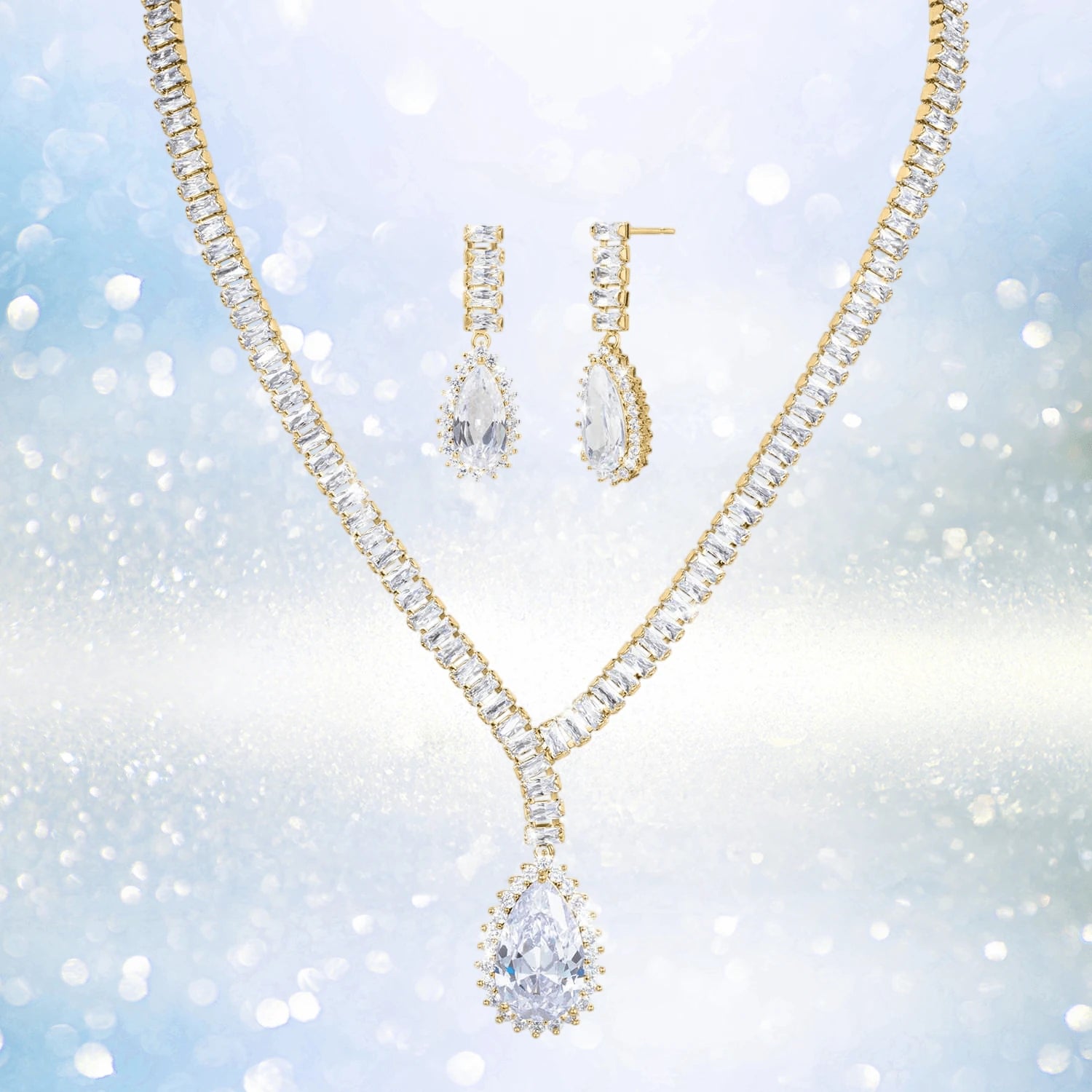 A dazzling showstopper collection, this is bound to attract attention. 158 twinkling white baguette cut Diamondeau® - flawless simulated diamond. sit delicately around the neck and flow to an over 12 carat pear drop extravaganza. The matching baguette and pear drop earrings complete this exquisite design, all finished in yellow gold plate. Look a million dollars without the million dollar price tag.