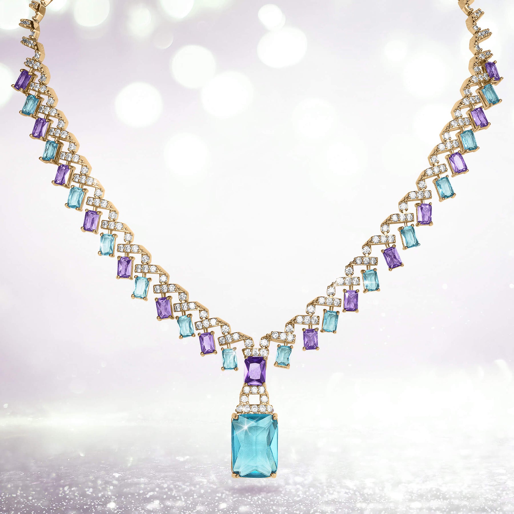 A breathtaking ladies two-piece collection. This ensemble is designed to captivate and enchant, finished in opulent yellow gold. The statement necklace is adorned in stunning emerald-cut stones in a shade of regal purple and serene light blue, each exuding an aura of grace and beauty. Interspersed among them are shimmering white Diamondeau®, flawless simulated diamond adding an extra touch of sparkle and brilliance. Completing this magnificent set are the matching drop earrings, designed to complement the necklace with their exquisite beauty. Together this set creates an outstanding spectacle.