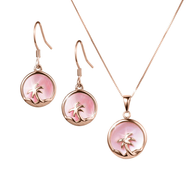 This beautiful collection captures the tropical elegance of the island life. Nature and style come together with this contemporary design. A sterling silver mount has been finished in rose gold with a stunning pink, mother of pearl in the center. Sat on top is a rose gold palm tree. Whether you are at the beach or on vacation, this piece will never go out of style!