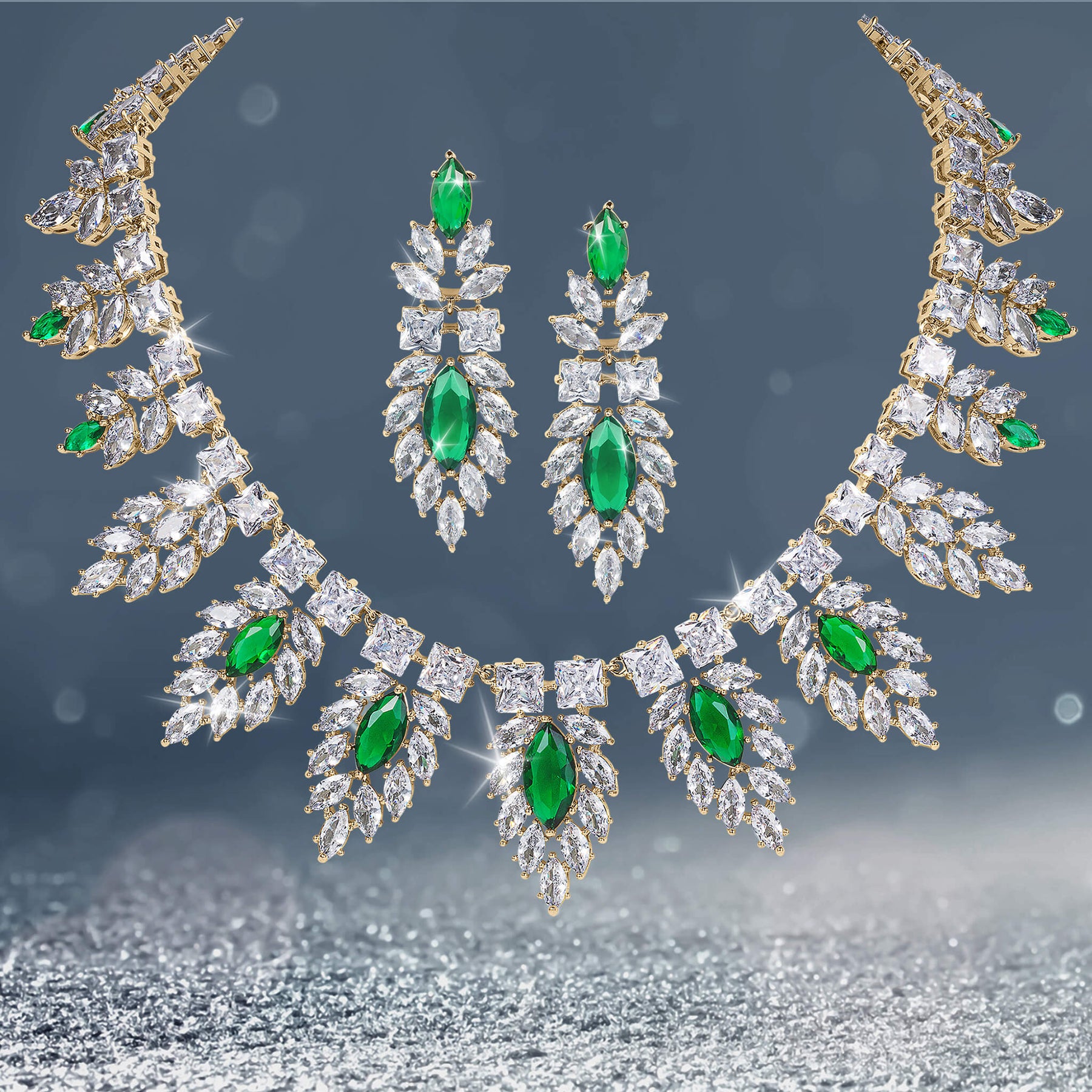 This collection is not for the faint of heart. This is for the woman who dares to stand out, who commands attention, and who knows the power of making a statement. A chunky necklace that rests gracefully against your neckline and earrings that frame your face with brilliance. The yellow gold finish adds an air of luxury and perfectly complements the precision set striking green and clear Diamondeau®, flawless simulated diamond. Add an element of drama and allure to your outfit.