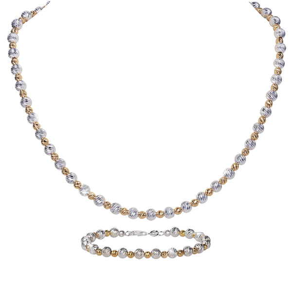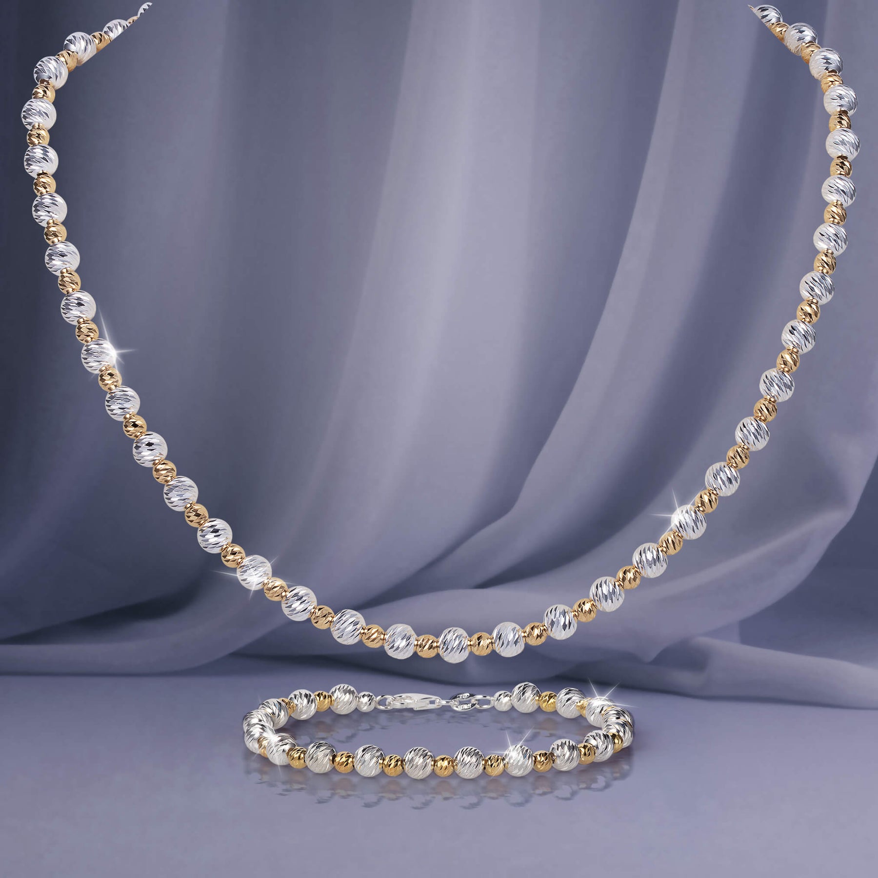 Step into the spotlight this party season with this stunning necklace and bracelet set, meticulously crafted in Italy from premium sterling silver. This exquisite set features a harmonious blend of gold plated and silver beads at different sizes, each diamond cut to enhance sparkle and depth, creating a dazzling effect that catches the light beautifully. The ideal collection for dressing up your evening attire or adding a touch of elegance to a casual outfit.