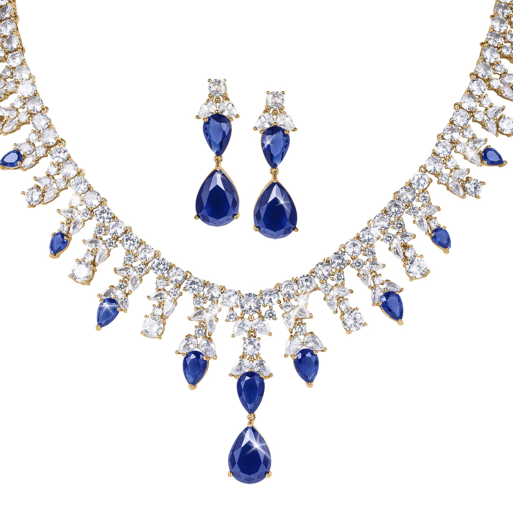 This set exudes a luxurious regal aura that captivates onlookers. The centerpiece of this ensemble lies in the stunning arrangement of Diamondeau®, flawless simulated diamond, in blue and clear stones, strategically positioned to make a profound impact. Each facet of this set sparkles with brilliance, reflecting light and illuminating your every movement. Finished in rich yellow gold, this set is a true testament to timeless beauty and sophistication.