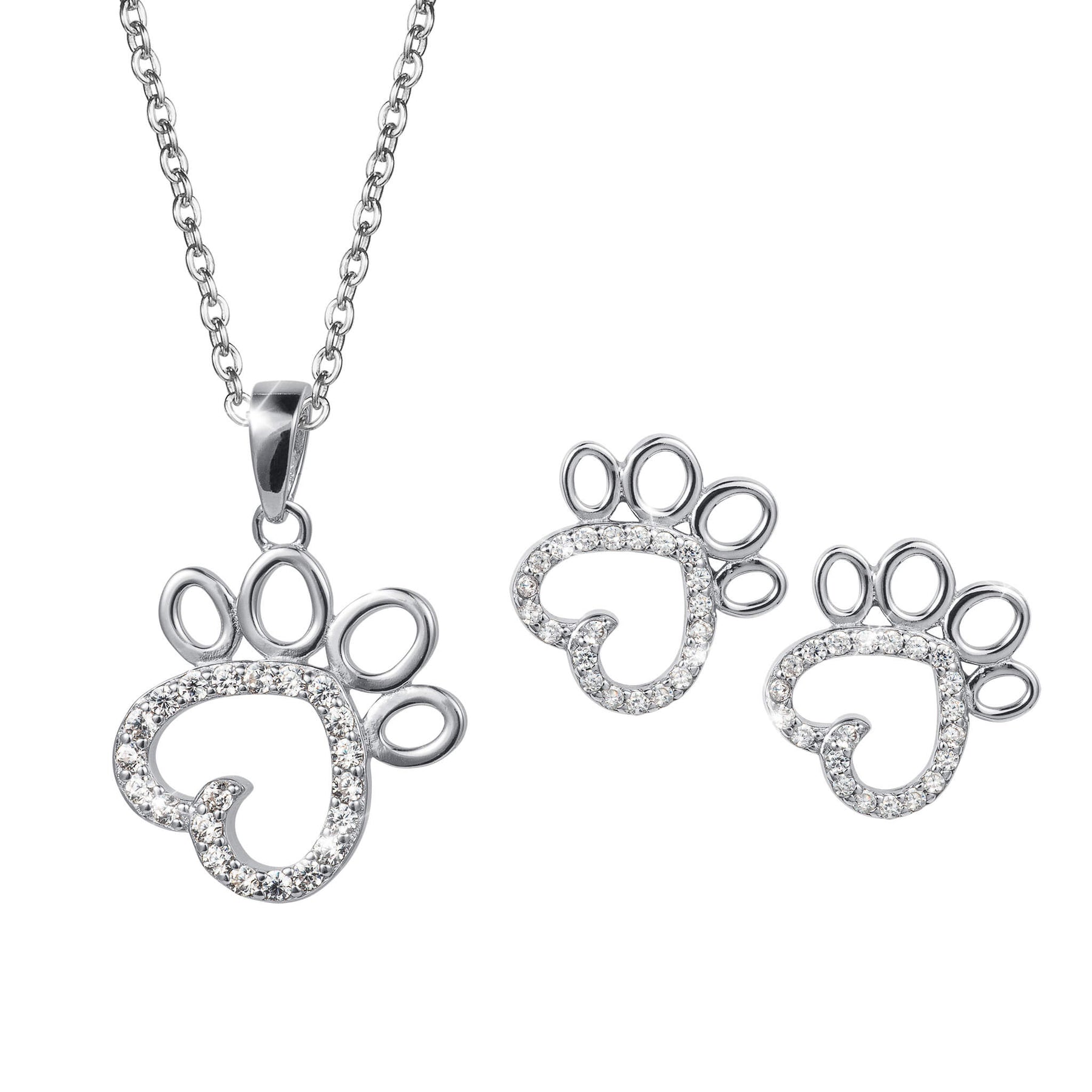 An exquisite set that features an open paw design crafted from sterling silver. The paw symbolizes the unconditional love and loyalty shared between pets and their owners. Set with shimmering Diamondeau®, flawless simulated diamond, adding a touch of sparkle and charm. Wear this set as a reminder of the special bond you share with your furry friend and the joy and companionship they bring into your life.
