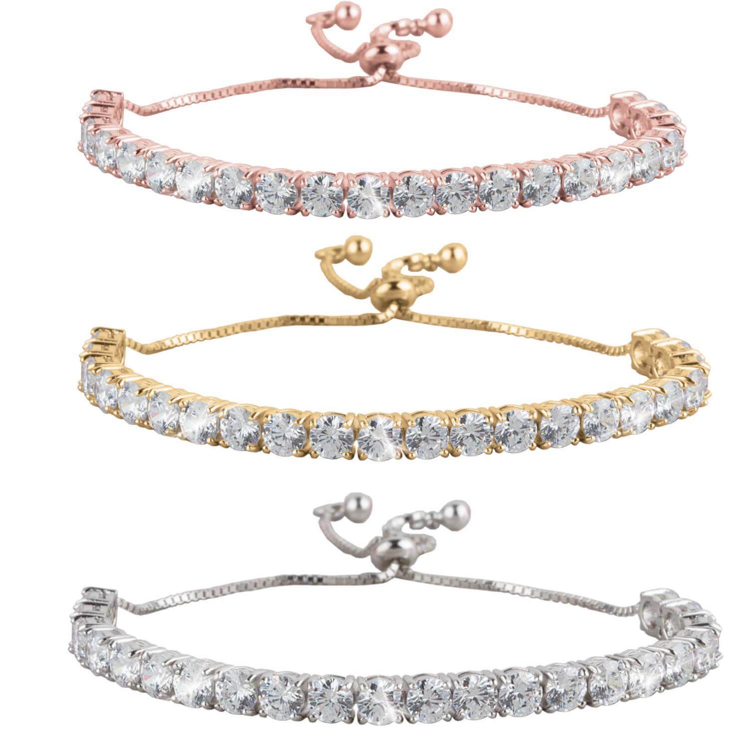 Adjustable bracelets have become an on trend jewelry item, not just for their gorgeous look, but they are so easy to put on. If you have trouble doing a bracelet up yourself this is perfect for you. Just pull one side and the bracelet easily fits around your wrist. Not only is this an awesome advantage to this magnificent bracelet, it is also set with 20 sparkly white Diamondeau® - flawless simulated diamond. We love this bracelet so much we have brought it to you in 3 colors. Choose from silver, yellow gold or rose gold. Why not get all three to create a fab layered look?