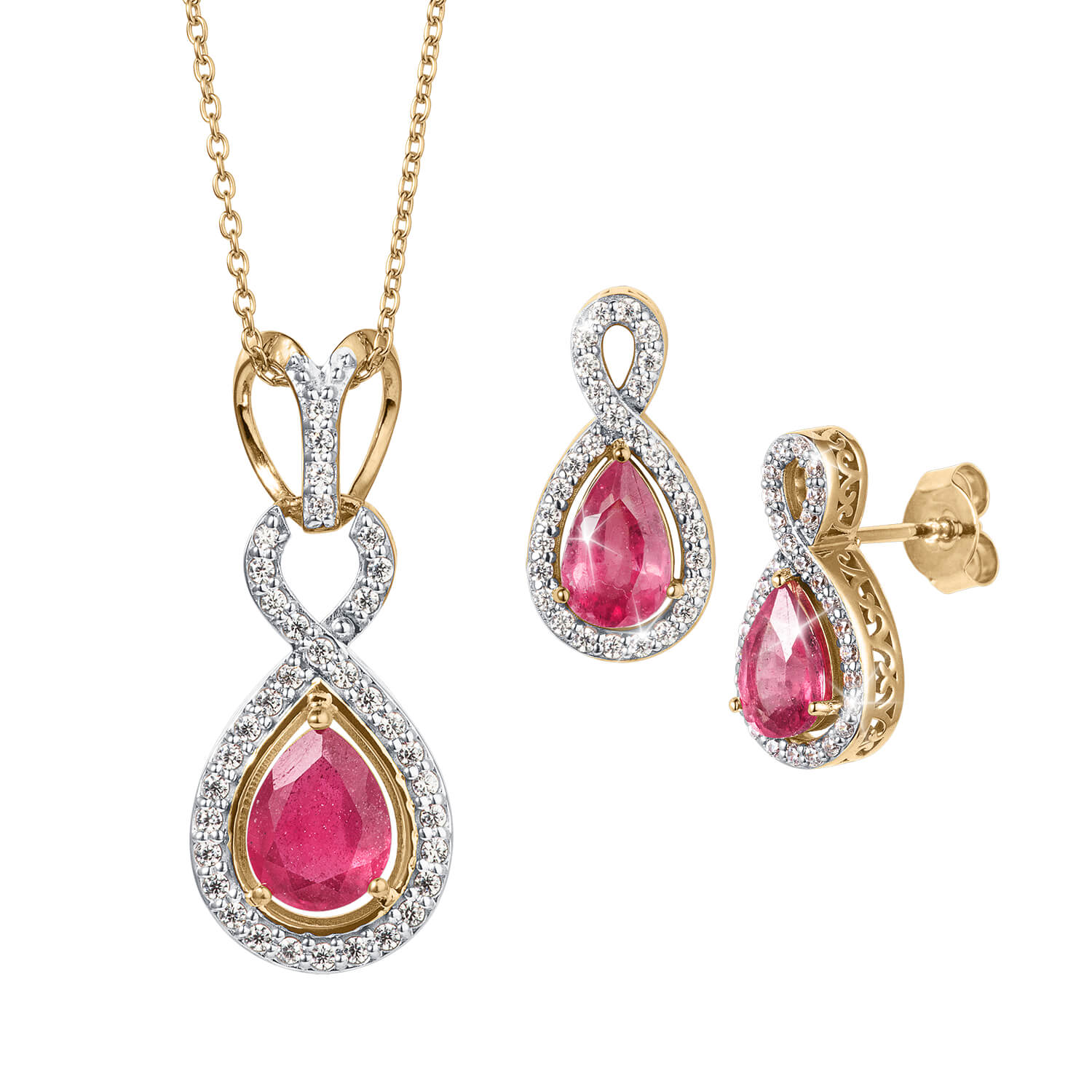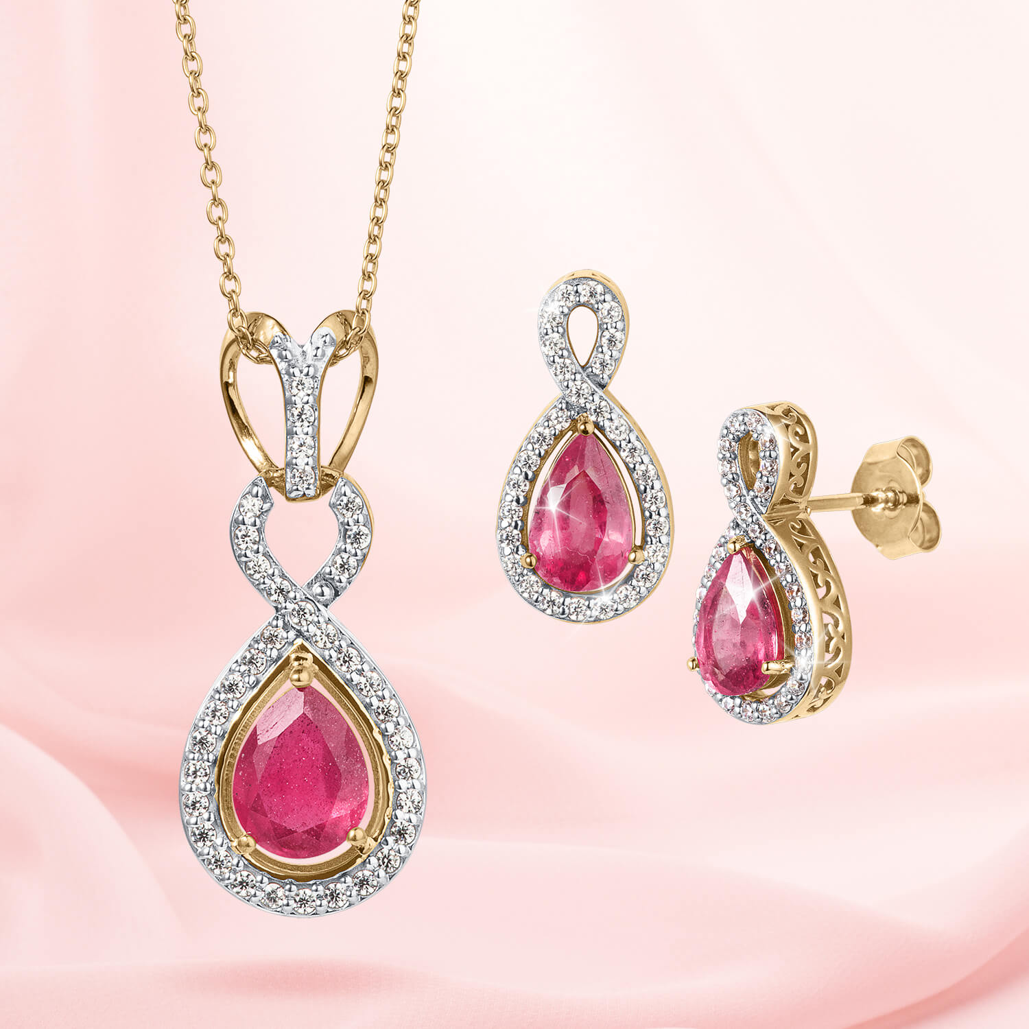 This collection is a beautiful reminder to spread the love and make everyone feel like they are the center of your universe. It also features Ruby the birthstone for July, making this the ideal gift. The mount is finely crafted from sterling silver, finished in 18k yellow gold, formed in an infinity symbol. Placed in the center is a pear shaped Ruby, encapsulated in shimmering white Diamondeau®, flawless simulated diamond. The earrings match the pendant in style and design.