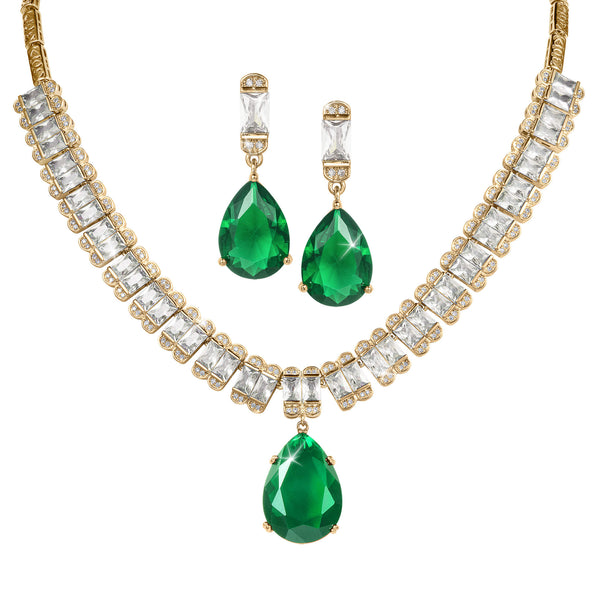 A radiant ensemble designed to elevate your elegance and captivate hearts. A carefully crafted chain finished in yellow gold, serves as a delicate frame, enhancing the allure of the shimmering Diamondeau®, flawless simulated diamond and providing a luxurious backdrop for the standout verdant pear drop stone. The design strikes a perfect balance between classic elegance and contemporary glamour, making it a versatile accessory for various occasions.