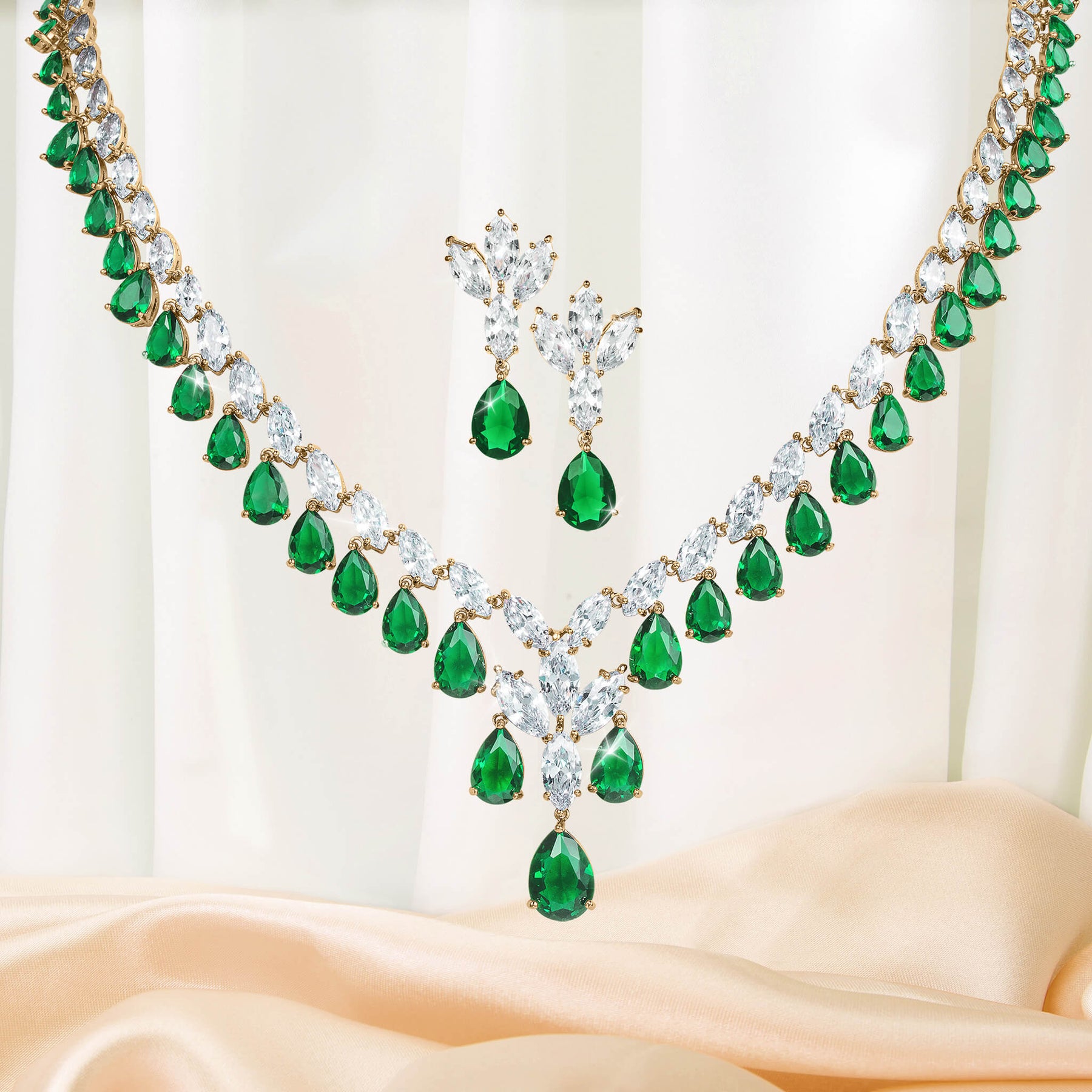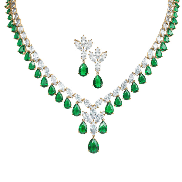 A stunning ensemble to make a statement, all finished in luxurious gold. The centerpiece of this set is a necklace adorned with captivating green and white Diamondeau®, flawless simulated diamond stones in marquise and pear shapes, creating a breath-taking effect. Each stone is expertly set to maximize its brilliance and sparkle. The combination of rich green and radiant white creates a striking contrast that lends an air of opulence to the design. Paired with the matching earrings, this set is the epitome of luxury and sure to leave a lasting impression.