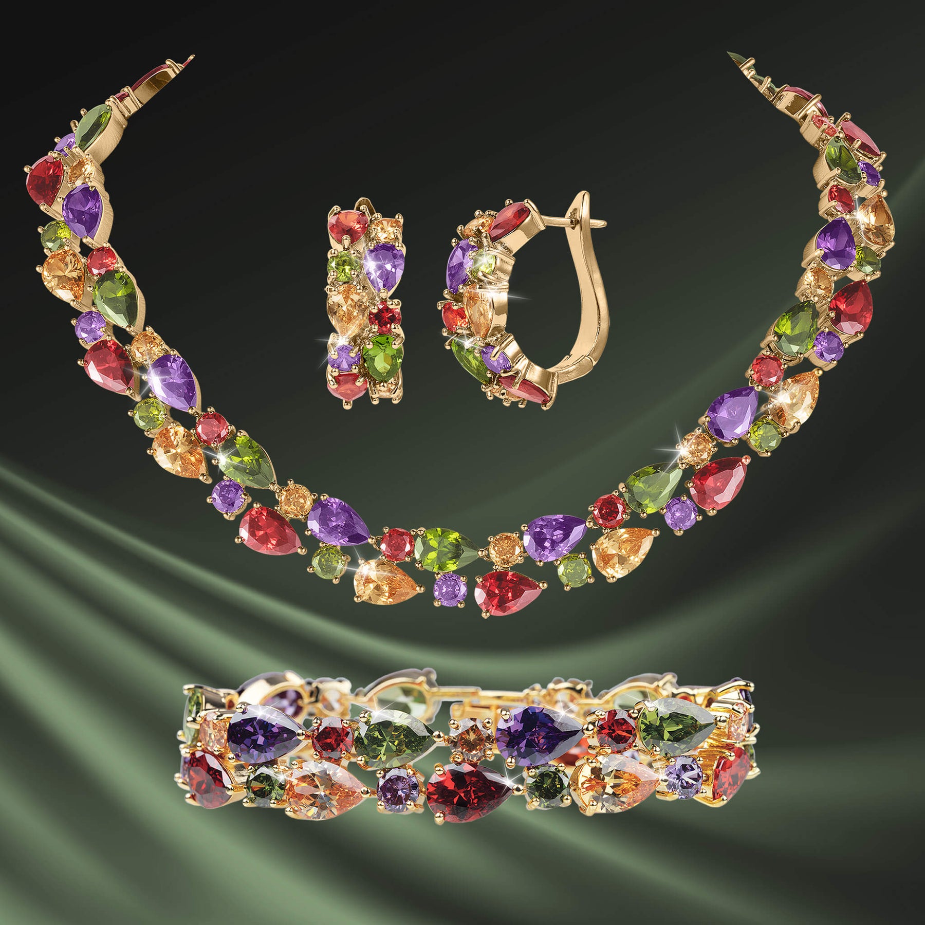 Designed to add a touch of elegance and color to your ensemble. A vibrant gold finished necklace is adorned with round and pear shaped sparkling Diamondeau®, flawless simulated diamond in shades of peach, green, red and purple. To complete the look, pair with the matching hoop earrings and best-selling Nevada Rainbow Bracelet, featuring the same dazzling stones, set in luxurious yellow gold finish. Together these pieces create a harmonious ensemble that oozes sophistication and style.