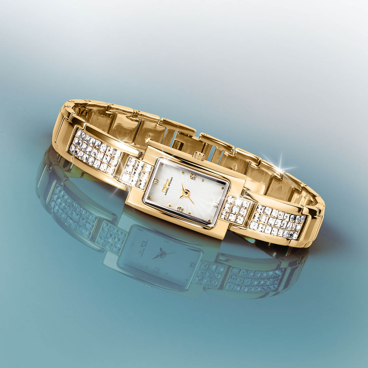 In High Society America’s super-rich get caught up in a Philadelphia Story remake that's full of glamor and energy. Wealthy socialites run amok in this delightful story. Add a touch of wealth to your jewelry wardrobe with this beautiful timepiece. The quality, polish and finish will speak for itself. Engineered from premium stainless steel, finished with gold or a two tone effect. Set with a precision quartz movement and hand set with over 66 sparkling Diamondeau®, flawless simulated diamond.