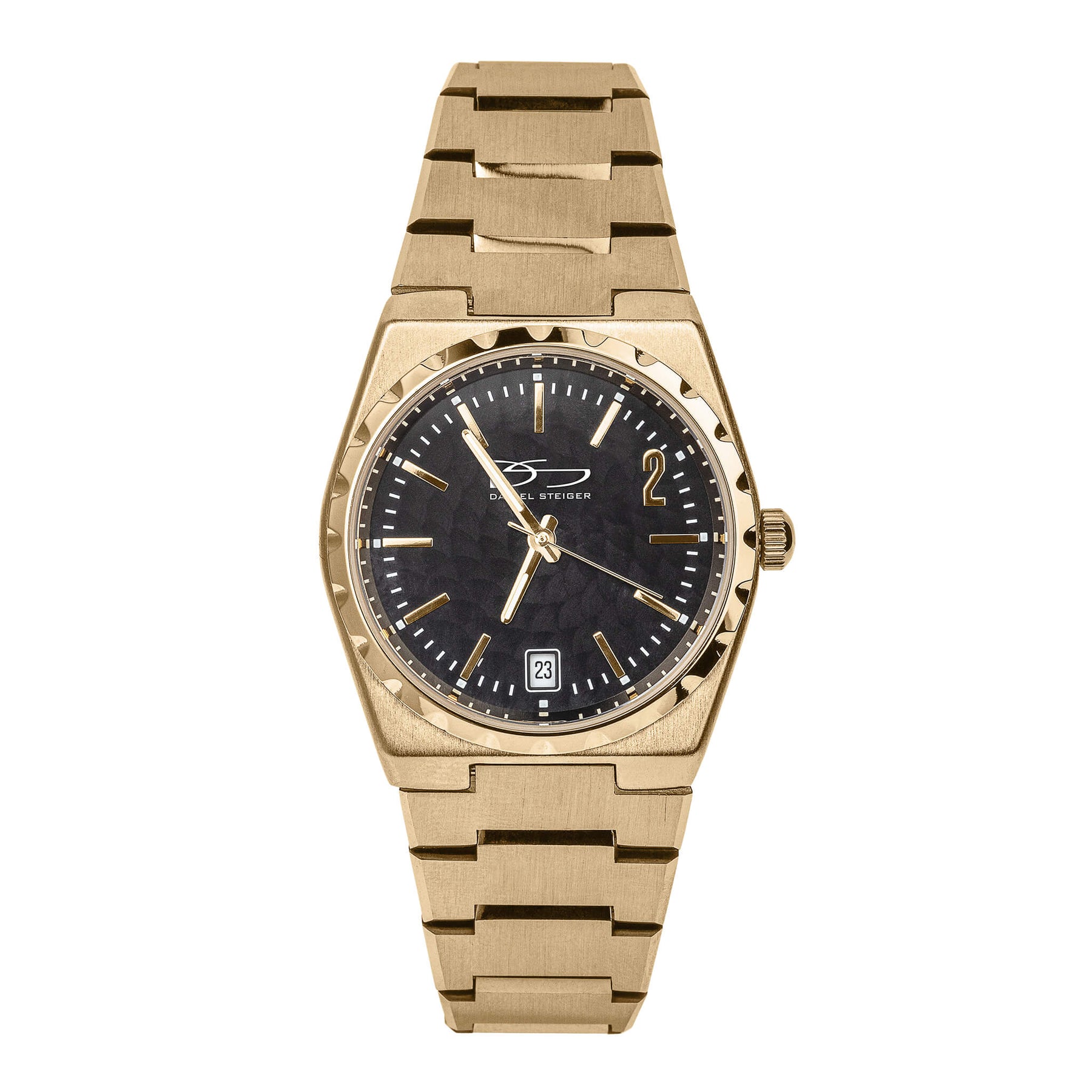 A stainless steel strap has been finished in yellow gold, exuding a sense of luxury and sophistication. The gold polished case and fancy grooved bezel, adds a touch of glamour, elevating the watch’s aesthetics to new heights. The dial boasts an intricate patterned design, this captivating detail adds a layer of depth and visual appeal, catching the light in a mesmerizing dance of shadows and reflections. Luminous hands ensures an easy read in low light conditions and useful date window keeps you up to date. A timeless design and versatile appeal makes it suitable for both formal and everyday wear.