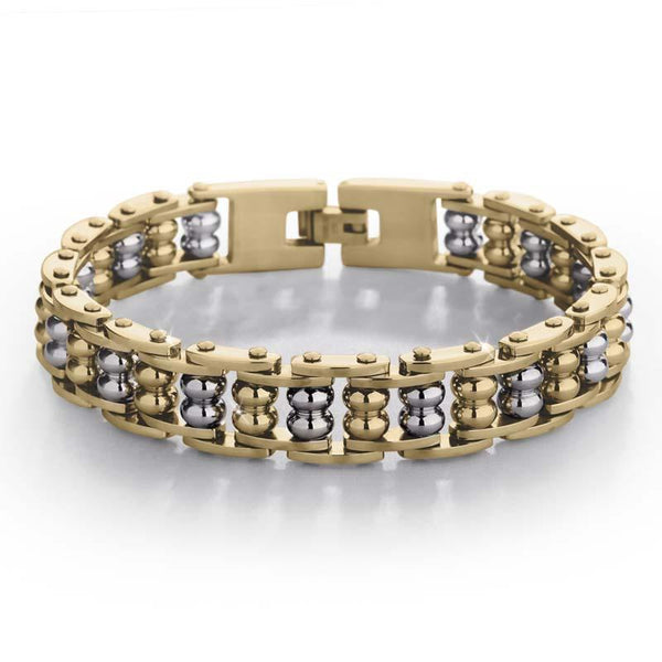 We tasked our master craftsmen with constructing these complicated bracelets. With over 115 individual components it is definitely something of a jigsaw puzzle to put together. Bead links of premium grade solid stainless steel that spin make up the band of the bracelet. Held together with precision placed plates and securely fastened with a fold over clasp. The stainless steel is finished in an impressive two tone effect. A real conversation piece.