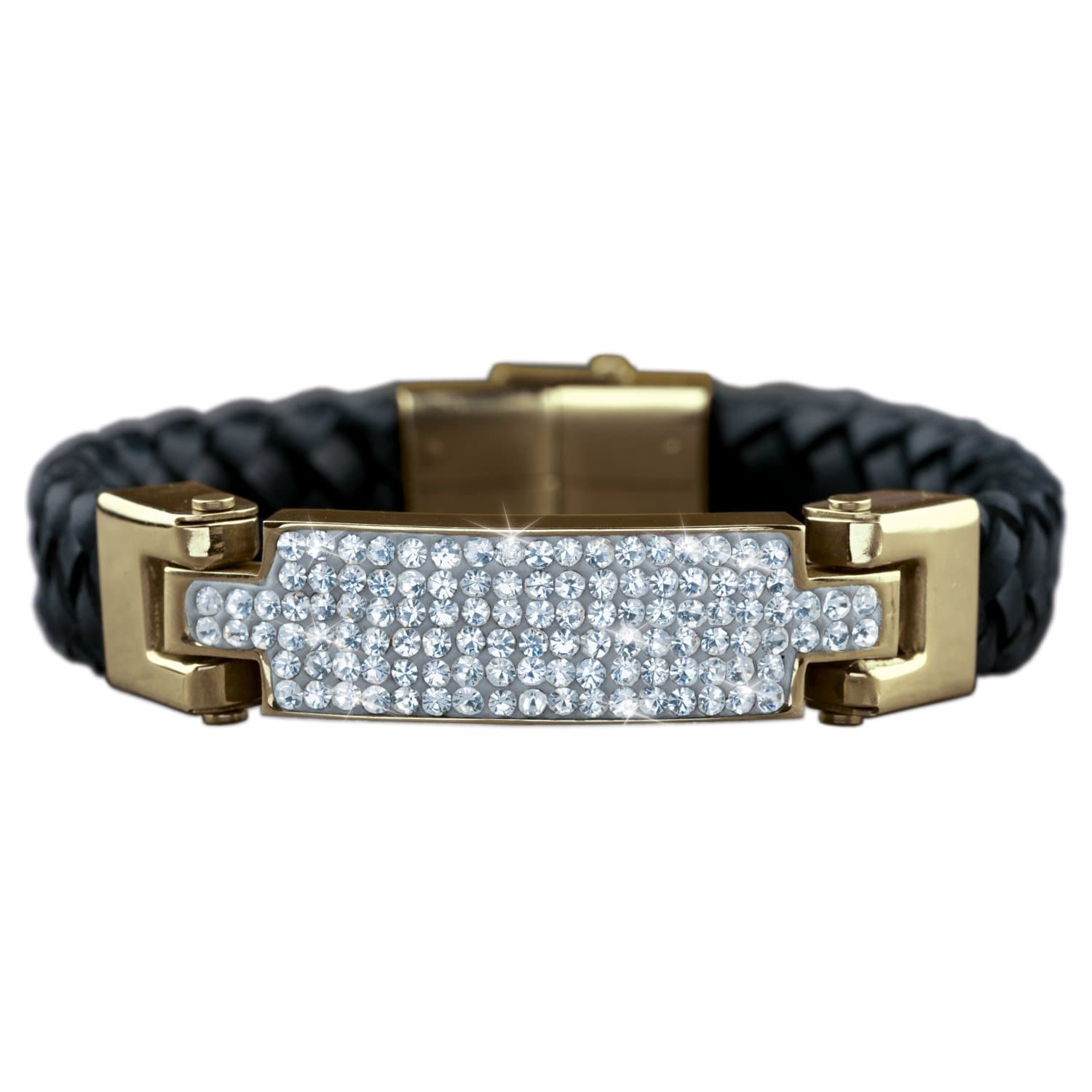 Bold and rugged, this handsome bracelet will be just his style. Fashioned from plaited black leather, this design features a gold plated stainless steel ID bar, encrusted with over 100 glistening crystals A look that can carry you through from the gym to the boardroom.