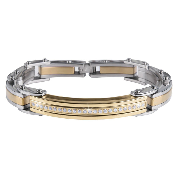 Crafted from premium stainless steel, plated with 18k yellow gold for a two-tone finish. An impressive ID bar sits at the center set with 24 of our signature Diamondeau® - flawless simulated diamond and a secure fold over clasp fastening; with precision craftsmanship at every turn. Unique pieces that will delight any jewelry lover and add a touch of luxury to your jewelry collection.