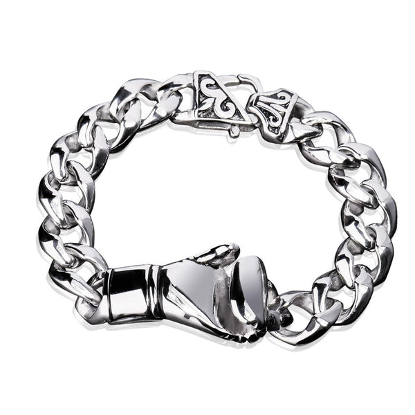 This unique Eye of the tiger collection is crafted from premium grade stainless steel, luxuriously plated with yellow gold. Comprising of a bracelet formed of classic curb links in which sits a magnificent formed boxing glove, which is 8 ½” in length. Matching single boxing glove pendant available, on 22” chain