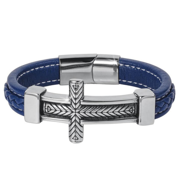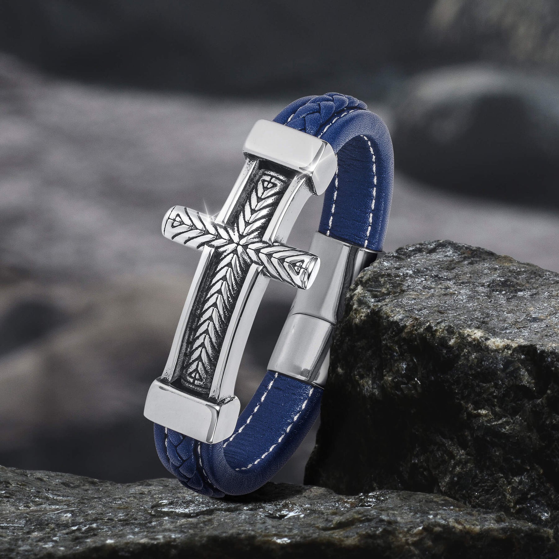 A blue leather band features a striking steel – plaited cross motif at the center, with the intricate plait detailing seamlessly continuing through the bracelet. Perfect for adding a bold statement to any ensemble, this bracelet is a versatile accessory for any occasion.