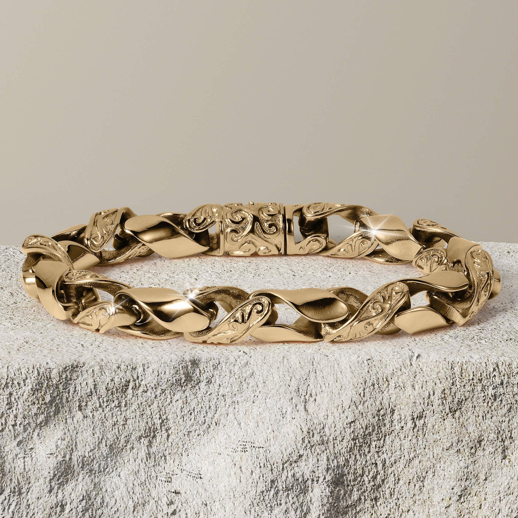 A bold statement bracelet, designed to elevate your style. Premium grade stainless steel finished in yellow gold. The unique links have a standout feature, an intricate scroll detail delicately twisted throughout the links, adding a touch of artistry and intrigue to your ensemble. Both a subtle touch of refinement and a symbol of strength, style and individuality.