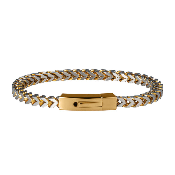Simple and good-looking, this versatile necklace and bracelet will be sure to become a go-to item. Designed with every day wear in mind, this modern look for the man on the go is durable, comfortable and practical. The square box shape rather than a flat look adds another dimension. Expertly crafted from premium grade stainless steel, with a two tone finish to give a sleek look. A stylish collection for the refined gent.