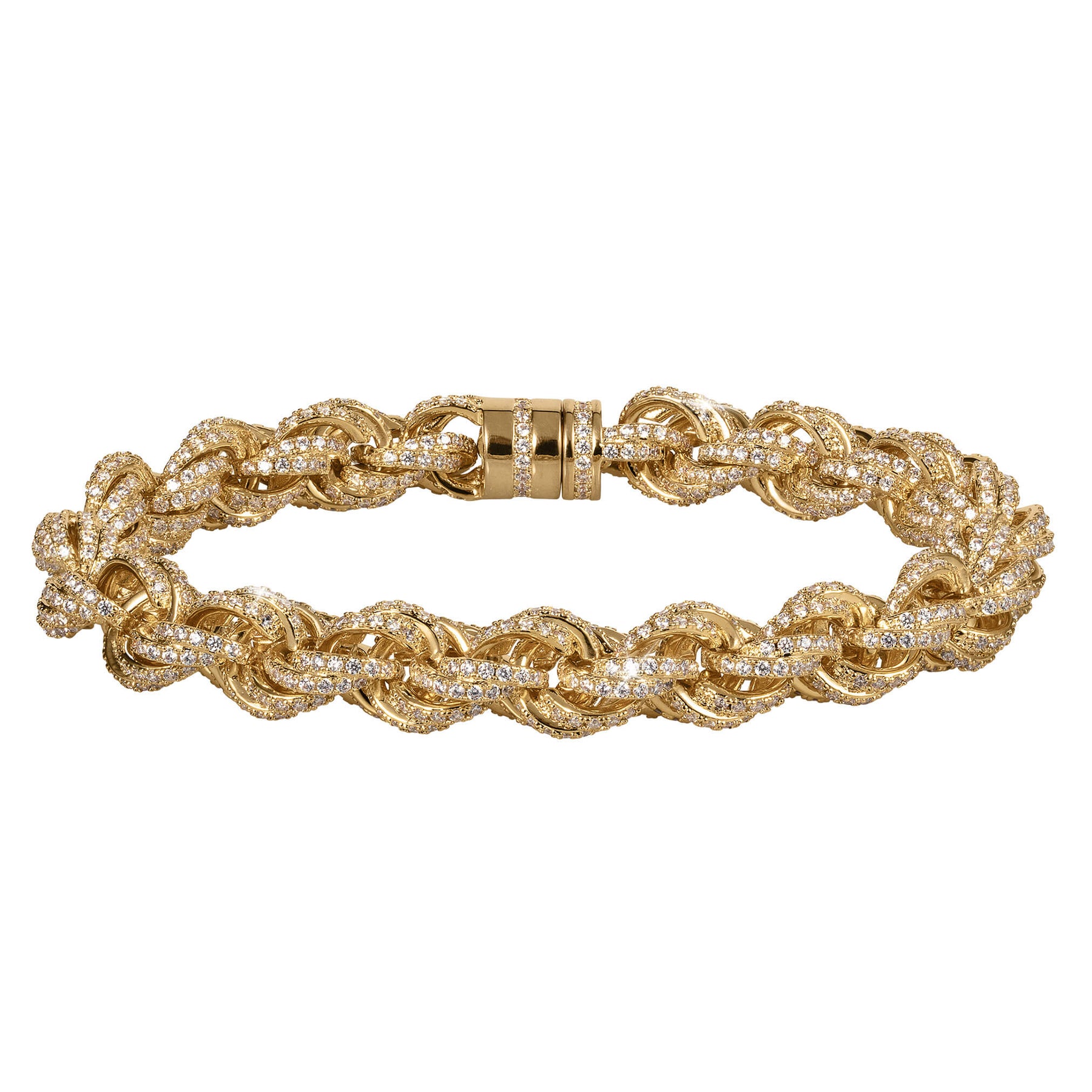 The epitome of bold elegance, crafted with precision and finesse, this statement chain is meticulously finished in radiant yellow gold. What truly sets this bracelet apart is its captivating embellishment, over 1,300 sparkling ice white Diamondeau®, flawless simulated diamond are methodically set along its length. Each stone glimmers with brilliance, creating an irresistible allure that captures the gaze of all who behold it. A true declaration of style and sophistication.