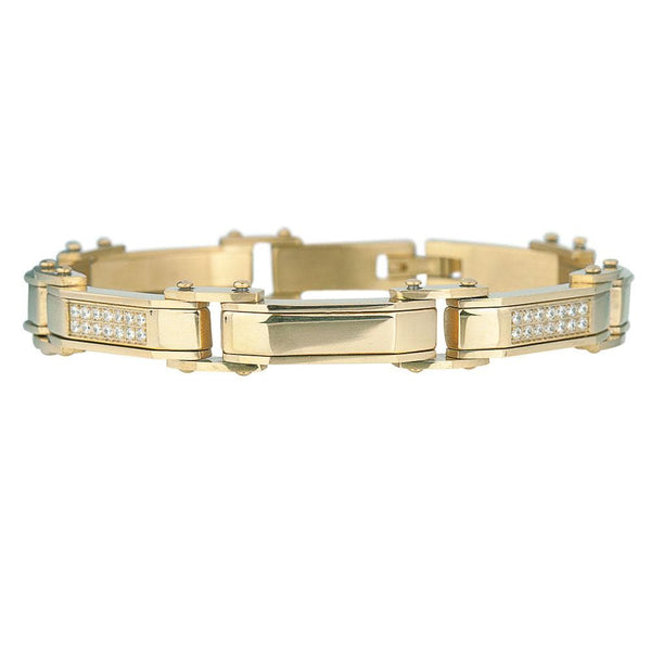 A stylish men's bracelet in solid premium grade stainless steel fused with a luxurious 18k yellow finish. Panels of flawless Diamondeau® - flawless simulated diamond add a final luxurious touch. Magnificent presentation case.