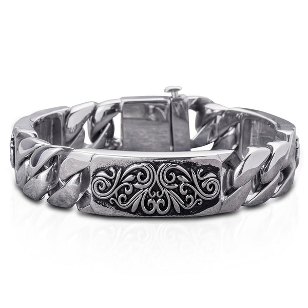We use only the best premium grade 316L solid Stainless Steel for our mens bracelets. This strong and powerful metal molds well and takes and excellent polish. Sections of curb bracelet interlink panels with intricate scroll detailing that was inspired by the amazing scroll work that is created by western leather craftsmen. Available in original Steel or plated in 18K Yellow Gold. Fits up to an 8.5 Inch wrist. Magnificent presentation case.