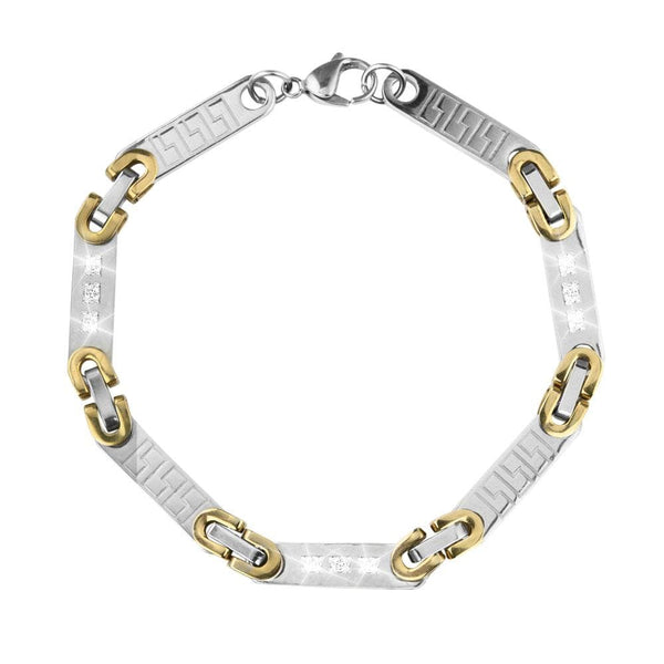 Links of premium grade 316L solid stainless steel are etched with a classical and ancient meander pattern that are held in place by curved links plated in 18k yellow gold. 3 of the links have been expertly set with panels of our flawless Diamondeau® - flawless simulated diamond. This modern and sporty bracelet is the perfect gift for any design conscious man that appreciates luxury.