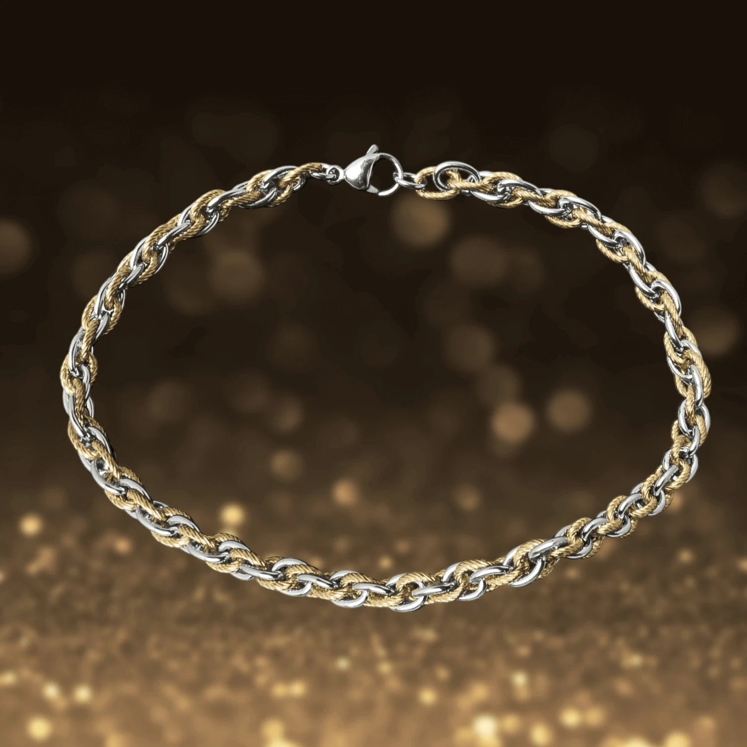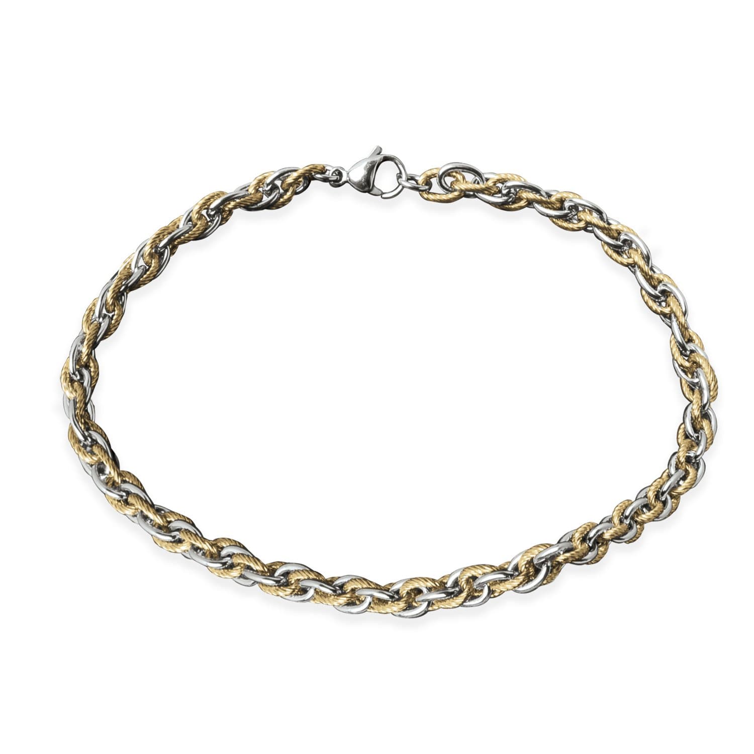 This collection is elegantly crafted in premium quality stainless steel. A classic Prince of Wales chain, formed from highly polished links and yellow gold textured links for a warm and classic tone. Adaptable enough to be worn every day or just for a special occasions.