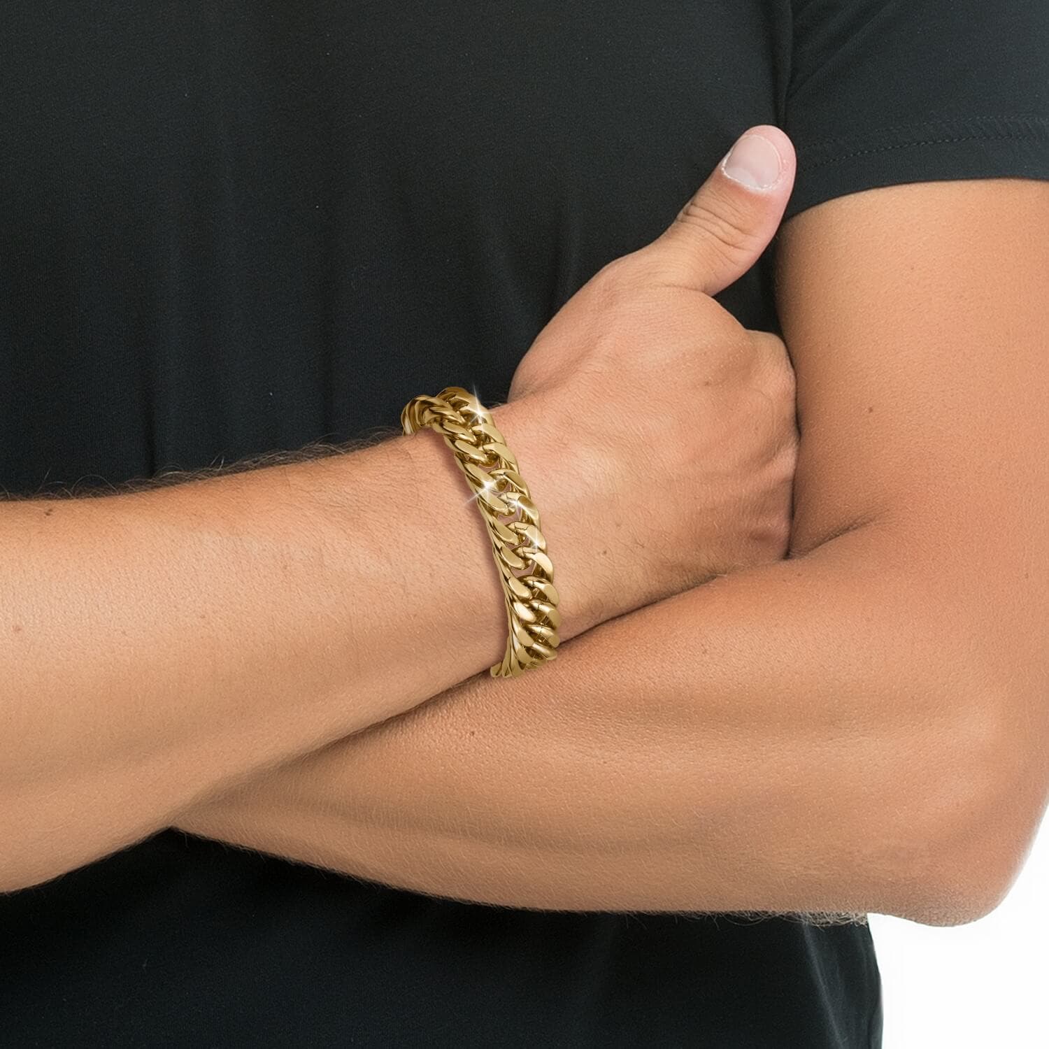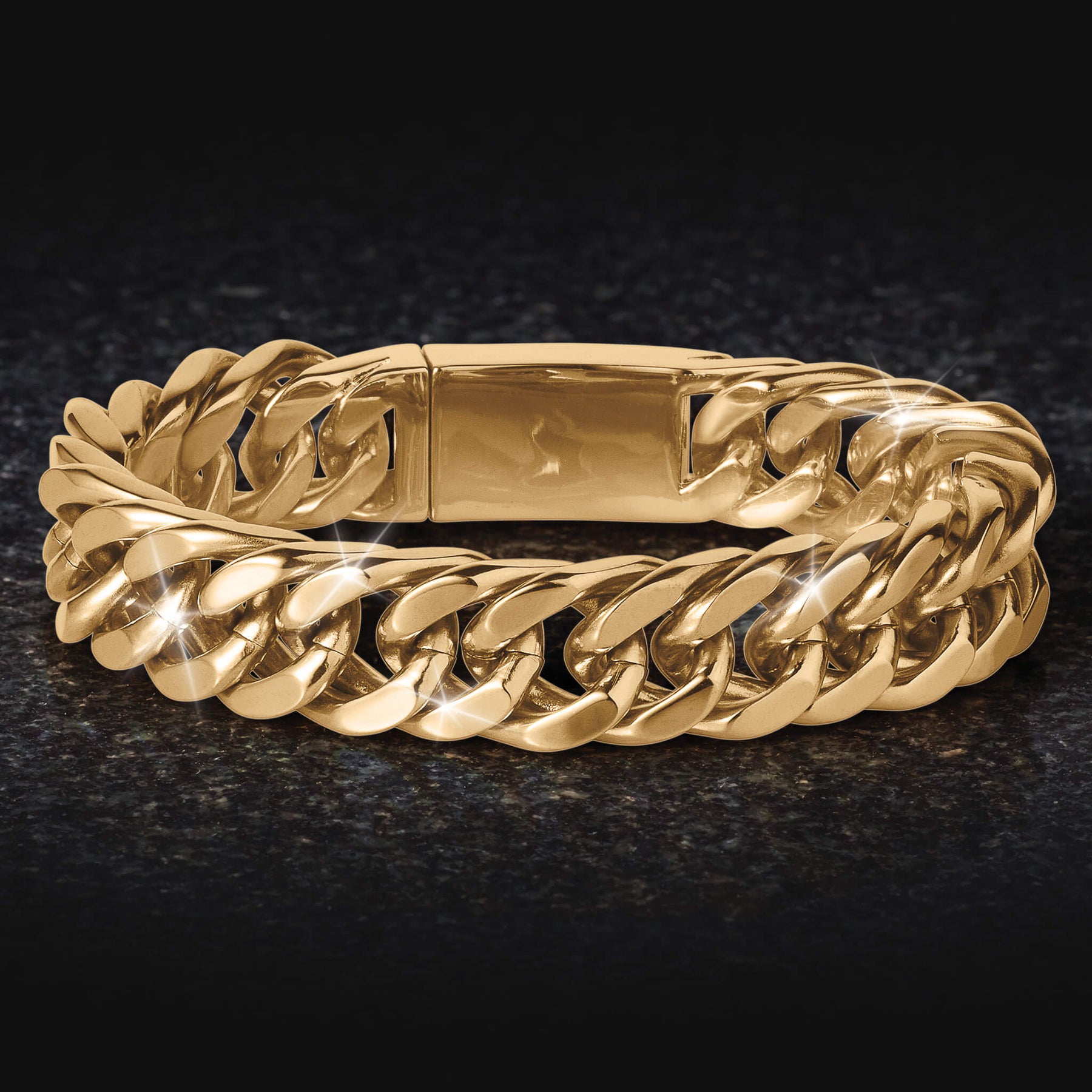 As with all our steel jewelry we have used only the best premium grade 316L solid stainless steel. This classic curb link design has been given a modern twist with our dazzling signature Diamondeau®, flawless simulated diamond decorating the clasp. Over 120 gems adorn each clasp on the bracelet and necklace. Complete your jewelry collection with this elevated classic in a luxurious gold finish.