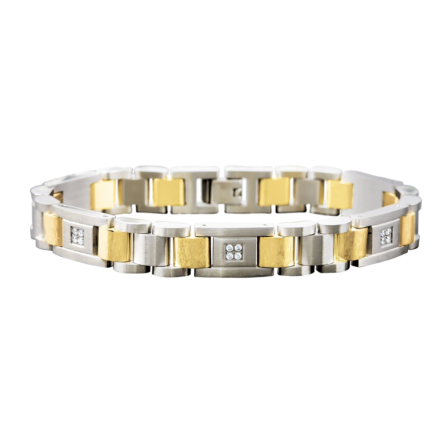 When you open our signature presentation box and get this new designer bracelet on your wrist, we predict that you won't want to take it off. Over 36 individual pieces of premium stainless steel are assembled to make this bracelet; 5 panels are set with 20 of signature Diamondeau® - flawless simulated diamond. Finished in a two tone finish, with 18k accents. Perfect for gift giving.