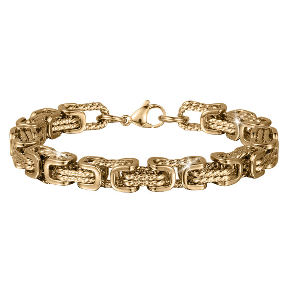 A masterpiece of intricate craftsmanship and enduring sophistication. Each link is meticulously designed in the iconic Byzantine pattern, showcasing a rich, interwoven texture that exudes timeless charm. Crafted from premium stainless steel and finished in a radiant yellow gold tone, this bracelet offers the perfect blend of strength and elegance.